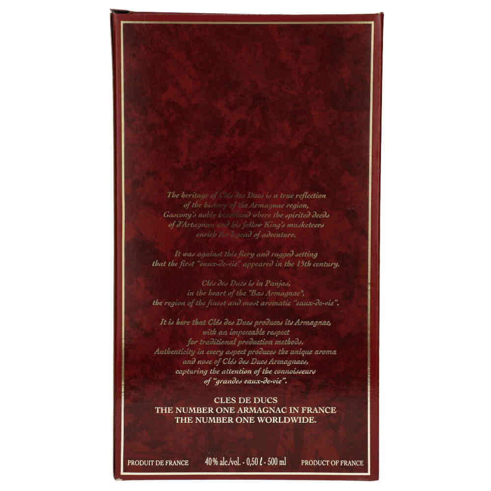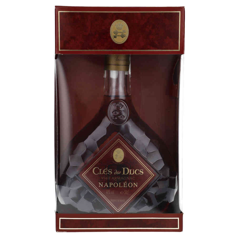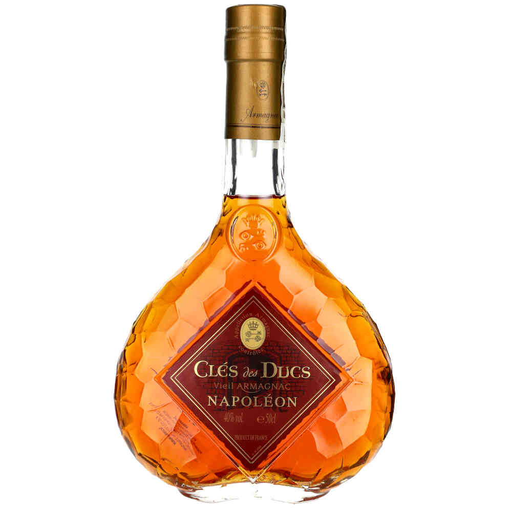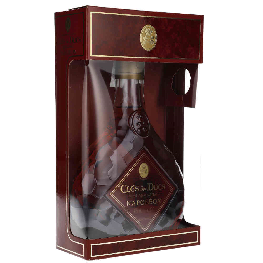 CLES DES DUCS NAPOLEON Wysoką jakość Cles des Ducs doceniłby zapewne sam Napoleon Bonaparte. Armaniak ten powstaje wyłącznie z winogron szczepu Ugni blac, zapewniających bogaty, niesłychanie krągły i harmonijnie zbalansowany smak. Leżakuje od 6 do 15 lat w beczkach o niskim lub średnim stopniu wypalenia. Ma piękny bursztynowy kolor z rubinowymi refleksami. Potężny zapach suszonych owoców, migdałów i orzechów. W tle wyczuwalna delikatna nuta dębu i pieprzu z przyjemnie długim finiszem.