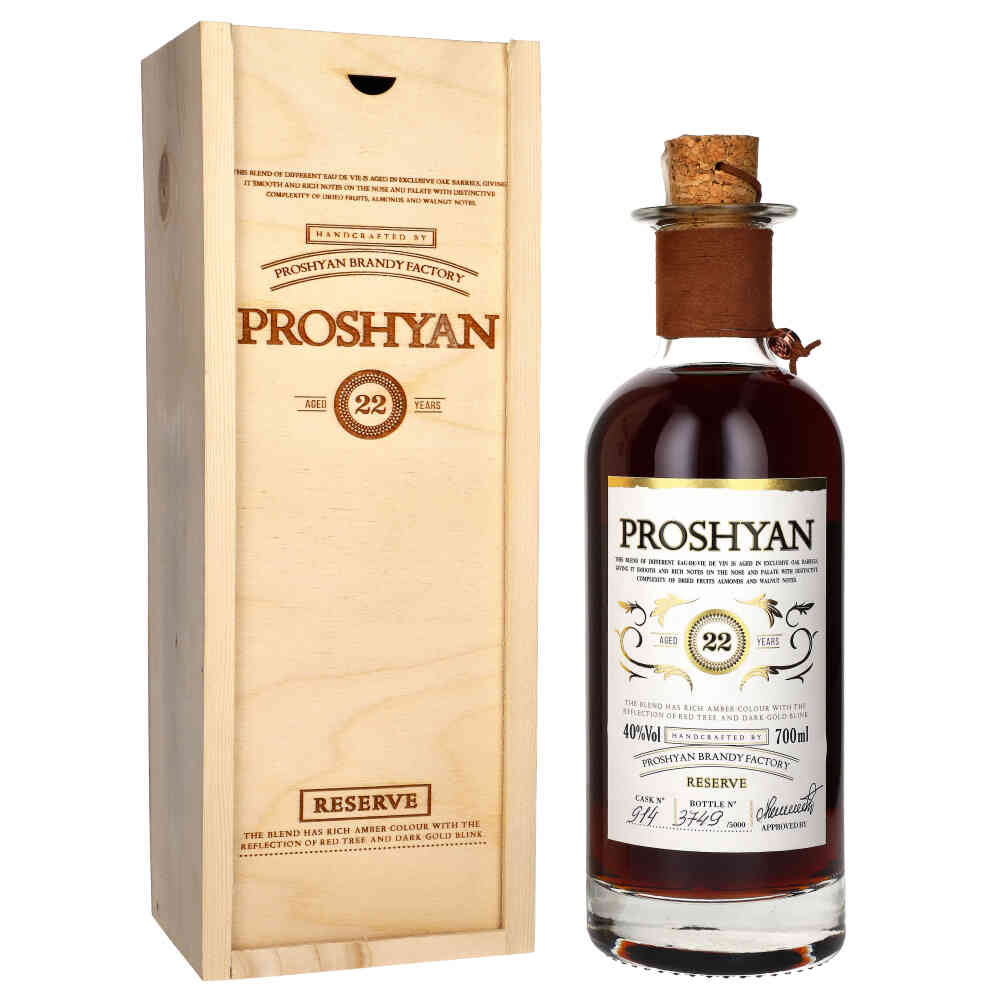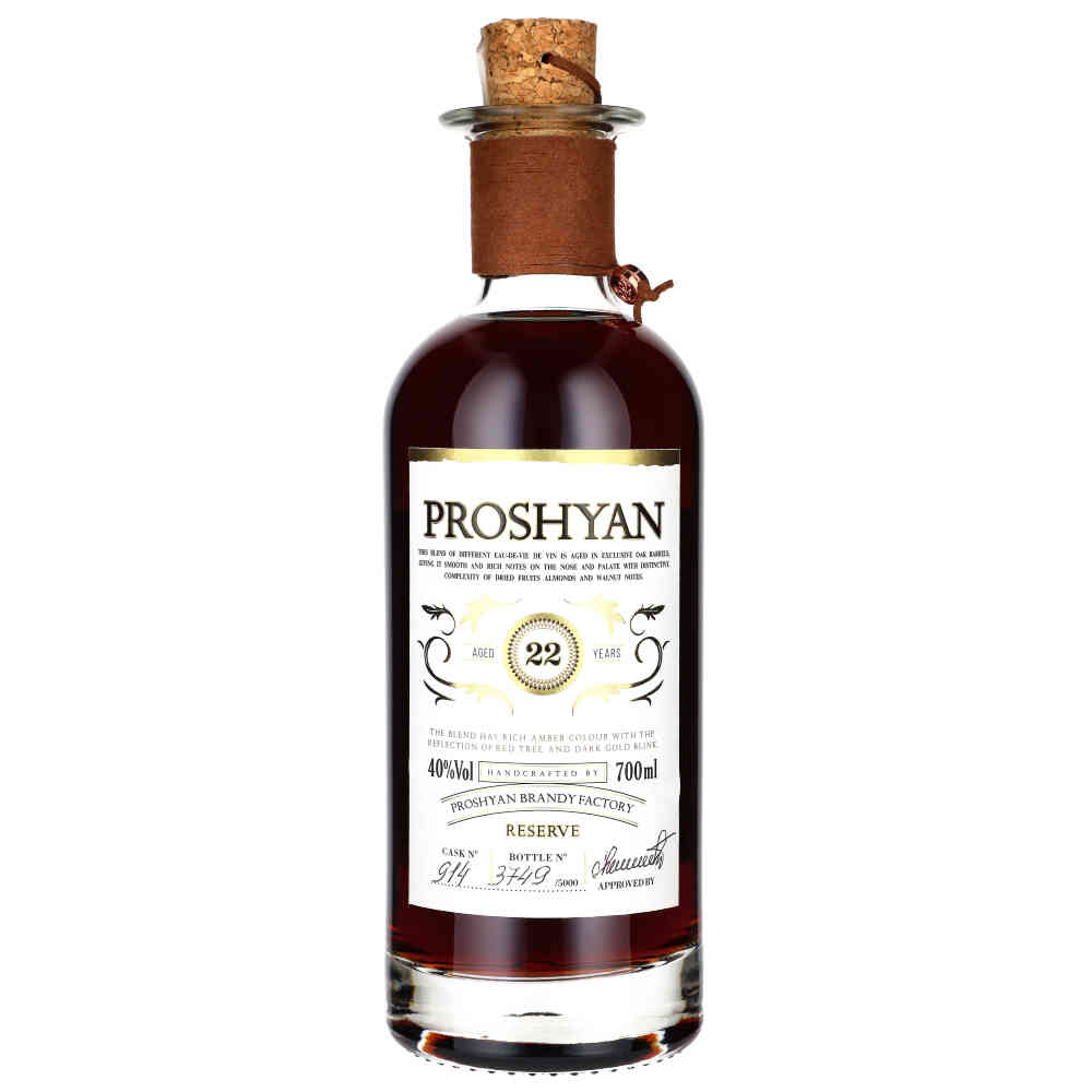 Brandy Armenian Proshyan 22YO powstała z odmian winogron Kangun i Bananc. Leżakowana minimum 22 lata w beczce dębowej (kaukaski dąb). Armenia, regiony Armavir, Tavush i Ararat.