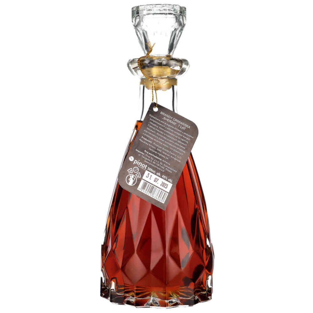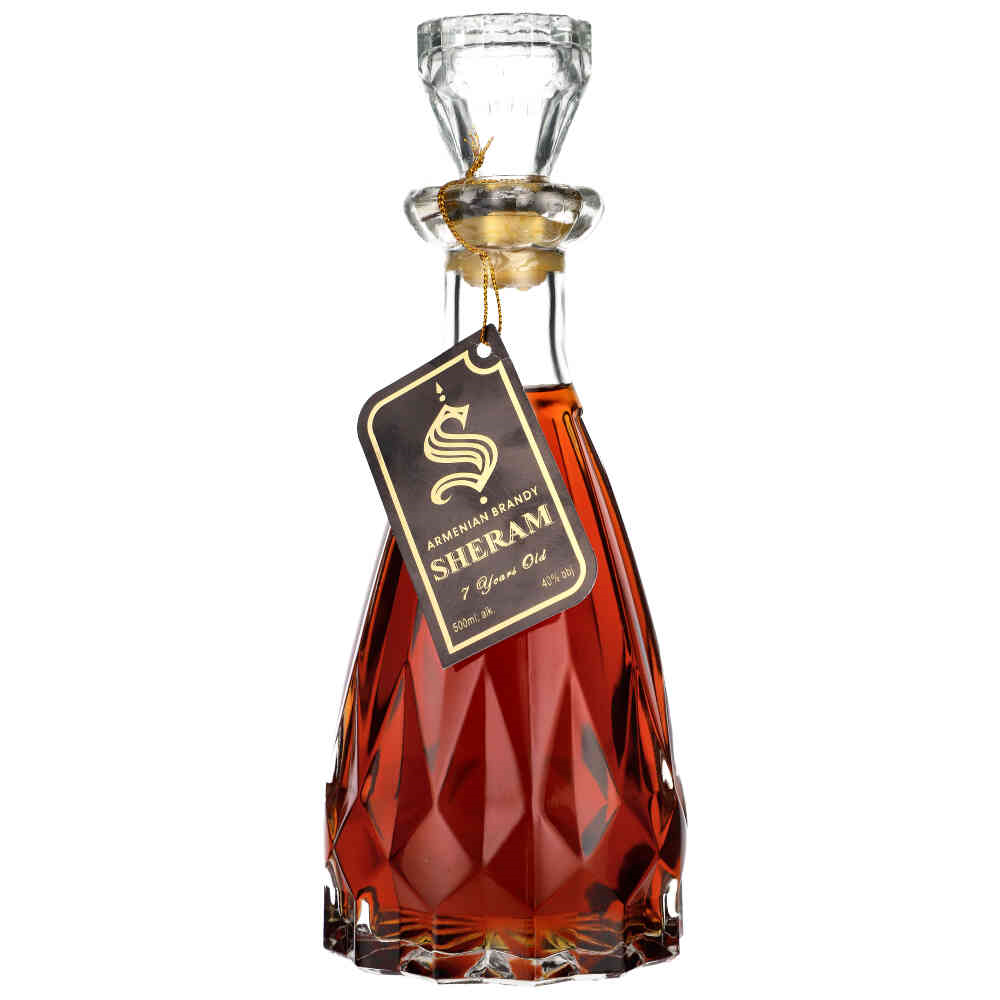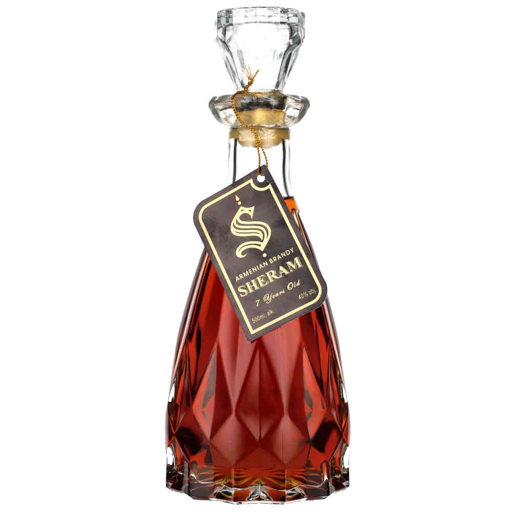 SHERAM 7YO BRANDY Sheram to jedna ze znakomitych brandy tworzonych w Erywaniu przez Proshyan Brandy Factory. Swą nazwę zawdzięcza najprawdopodobniej żyjącemu na przełomie XIX i XX wieku ormiańskiemu kompozytorowi Sheramowi. Sama brandy wytwarzana jest w regionie Armawir z destylatów komponowanych z odmian winogron Kangun i Megabuy i starzonych co najmniej 7 lat w klasycznym dębie. Harmonijna, z bardzo dobrym balansem między akcentami słodko-waniliowymi a lekko wytrawną nutą korzenno-dębową.