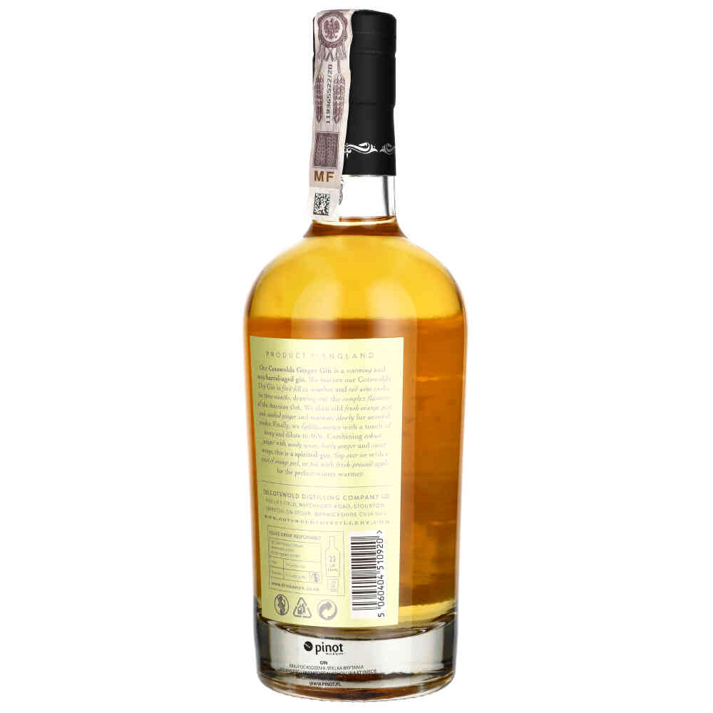 Cotswolds Ginger Gin to rozgrzewający i pikantny gin leżakowany w beczkach. Łączy w sobie Cotswolds Dry Gin, beczki z amerykańskiego dębu, kandyzowany imbiri nuty świeżej skórki pomarańczowej. Dodatkowo wyczuwalne są w nim nuty ciepłego miodu, pikantnego imbiru i sosnowego jałowca, dzięki temu gin ten ma wyjątkową głębie smaku.