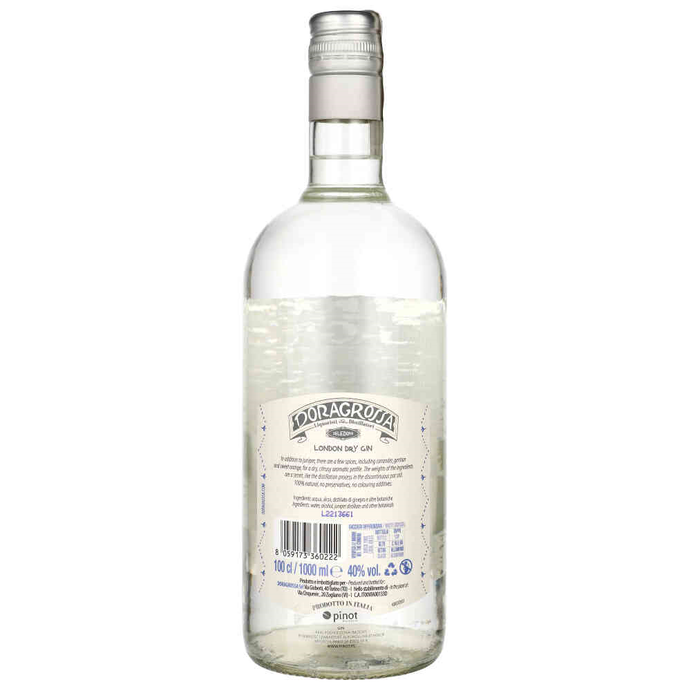 Gin Doragrossa London Dry to klasyczny gin o włoskim charakterze, pochodzący z Turynu. Jest to trunek wytwarzany z naturalnych składników, w tym jałowca, kolendry, irysów, bylicy piołun, goryczki, słodkiej pomarańczy i lawendy, co nadaje mu wyjątkowy aromat i smak. Jego profil smakowy łączy nuty cytrusowe, korzenne i kwiatowe, co czyni go idealnym wyborem zarówno do koktajli, jak i do picia na czysto.