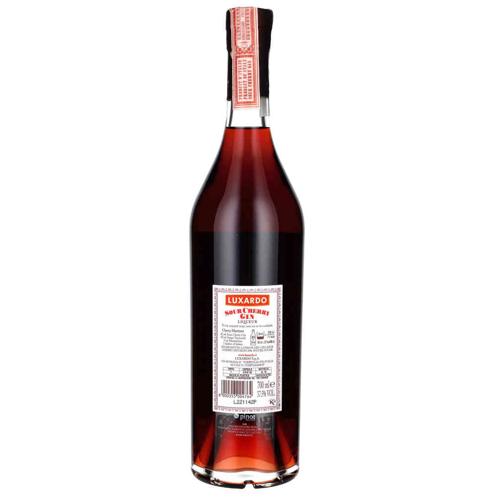 LUXARDO SOUR CHERRY To zbalansowane połączenie słodkiego soku z wiśni maraska z wytrawnym destylatem Luxardo London Dry Gin. Złożony i bogaty aromat wiśni maraska oraz ich intensywna czerwień doskonale komponuje się z ziołowymi nutami jałowca. Początkowy smak jest typowy dla ginu z pikantnym długotrwałym kwaskowatym posmakiem. Luxardo Sour Cherry Gin doskonale nadaje się do wielu klasycznych koktajli, takich jak Martinez i Gin Fizz lub do picia saute/ solo na kostkach lodu.