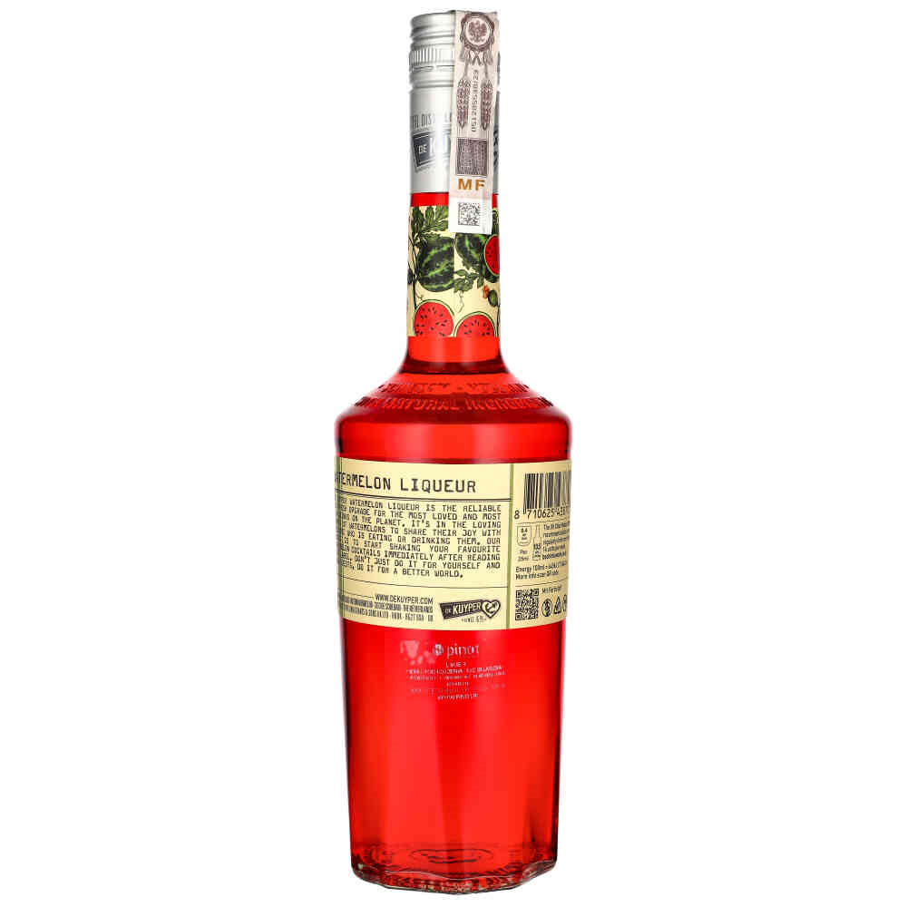 Likier De Kuyper Watermelon to orzeźwiający i owocowy likier o smaku soczystego arbuza. De Kuyper oferuje aromat arbuza, oferując przyjemny, słodki profil z subtelnymi nutami kwiatów fiołków i słodkich cukierków. Charakteryzuje się intensywnym, różowym kolorem, który wyróżnia się wśród zwykle zielonych likierów melonowych. W smaku łączy soczystego arbuza z nutami dojrzałych skórek arbuza i lekkim, pieprzowym akcentem, co nadaje mu unikalny charakter.