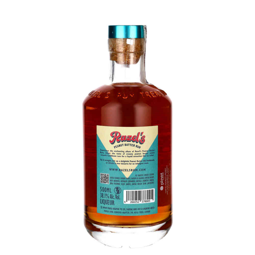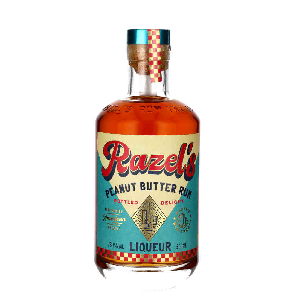 RAZEL'S PEANUT BUTTER RUM LIQUEUR to unikalne połączenie karaibskiego rumu z kremowym, lekko słonym masłem orzechowym. Nuty wanilii, czekolady, prażonych orzechów i solonego karmelu tworzą deserowy, aksamitny smak.