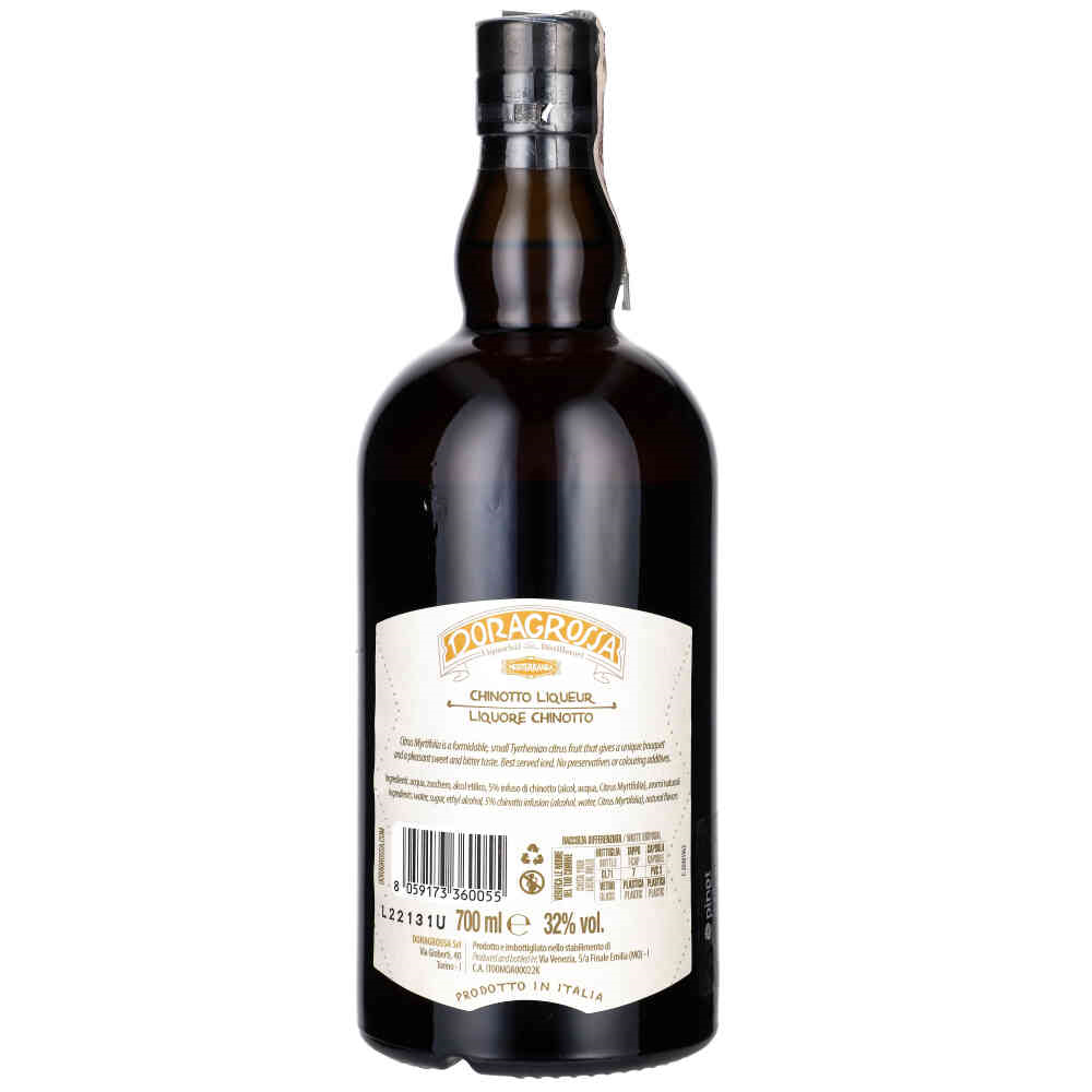 DORAGROSSA LIQUORE CHINOTTO Nazwa likieru - „Chinotto” nawiązuje do nazwy małego owocu cytrusowego - „Citrus Myrtifolia”, który rośnie na niewielkich obszarach rolniczych, w pobliżu Morza Tyrreńskiego. Ten wyjątkowy owoc słynie ze swych niezwykłych właściwości, a dobrze obrobiony oferuje cudowną kombinację aromatów i odpowiednio zbalansowanych słodko-gorzkich smaków, które zachwycą niejedno podniebienie. Produkt wytwarzany jest ze szczególną starannością i jest całkowicie naturalny. Można go serwować na czysto, na kościach lodu lub w ulubionym koktajlu alkoholowym. Na froncie butelki uwagę zwraca etykieta w białym kolorze, na której dostrzec można owoc - Chinotto będący głównym składnikiem trunku. Całość – rysunek, kolorystyka i wypełniająca etykietę czcionka, przywodzą na myśl włoskie klimaty.