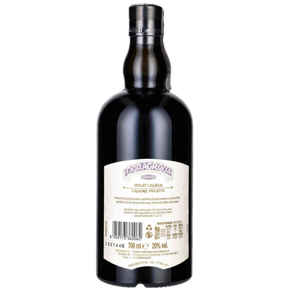 DORAGROSSA LIQUORE VIOLETTA Delikatny włoski likier urzekający przyjemnym aromatem wiosennych kwiatów i wędrówki po łąkach w poszukiwaniu ziół. Świetnie nadaje się do degustacji na czysto – najlepiej w temperaturze pokojowej lub na kościach lodu oraz do gotowania czy przyrządzania wyśmienitych dań. Słodkie nuty wyróżniają go na tle innych podobnych ekspresji. Idealne dopełnienie domowej kolekcji – likier Violetta to baza klasycznego koktajlu Aviation. Subtelne kolory biało-fioletowe, genialnie komponują się z aromatyczną zawartością.