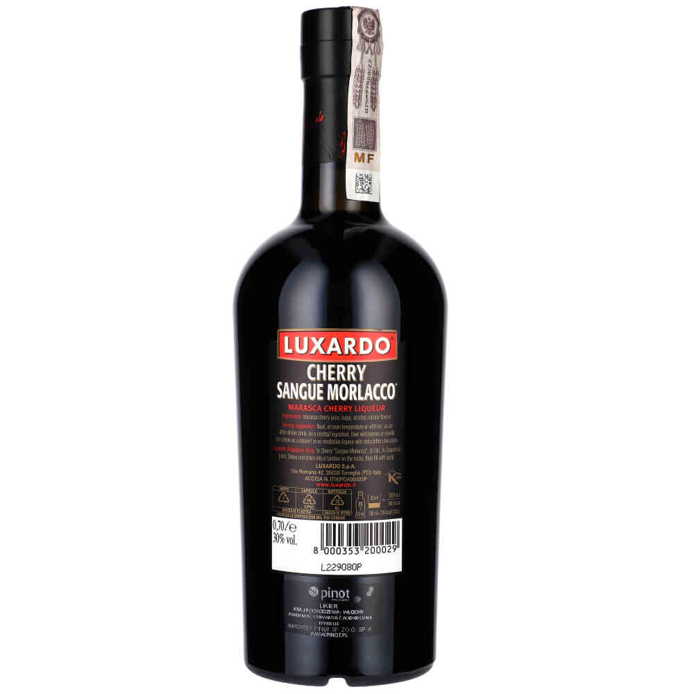 LIKIER LUXARDO CHERRY "SANGUE MORLACCO" - to likier wiśniowy produkowany z dojrzałych wiśni maraska. Po zbiorach, część soku poddawana jest naturalnej fermentacji, a następnie wzmacniana alkoholem i dojrzewa w dębowych beczkach. Likier ma głęboki czerwony kolor i intensywny aromat świeżo wyciskanego soku wiśniowego. Smak jest gęsty, słodki z nutą cierpkości. Idealny do koktajli, jako digestif, a także w połączeniu z ciemną czekoladą, serami, jagodami czy lodami.