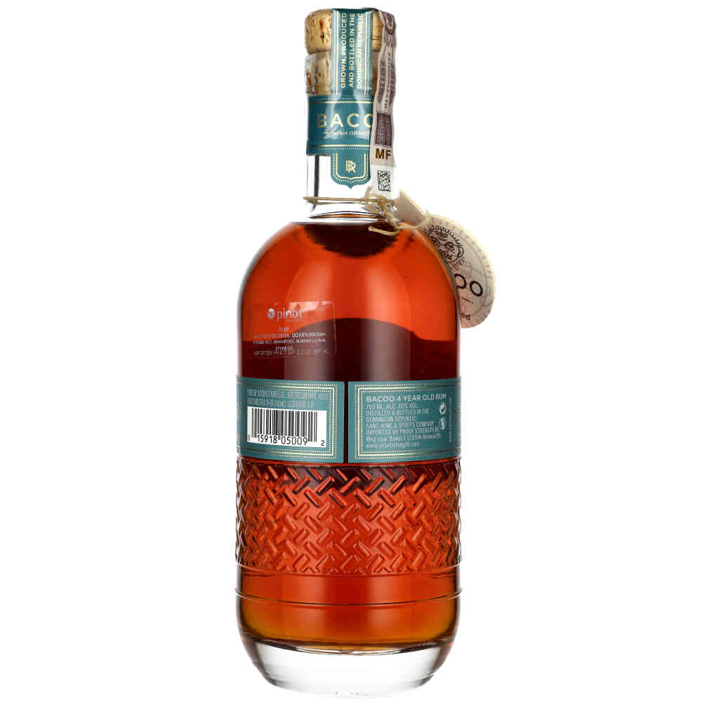 BACOO 4 Year Aged Rum to wszechstronny i przystępny rum, starzony przez okres 5 lat. Kandyzowane, orzechowe aromaty karmelu, miękkiej papai, serc palmowych i bananów. W smaku delikatna nuta banana z oleistym, miękkim i niewysuszonym posmakiem. Bogate odczucie w ustach i pełny smak wybija się w tym starzonym rumie. Finisz rozgrzewający, interesujący, długi finisz z masłem orzechowym, toffi i ciastem ananasowym.