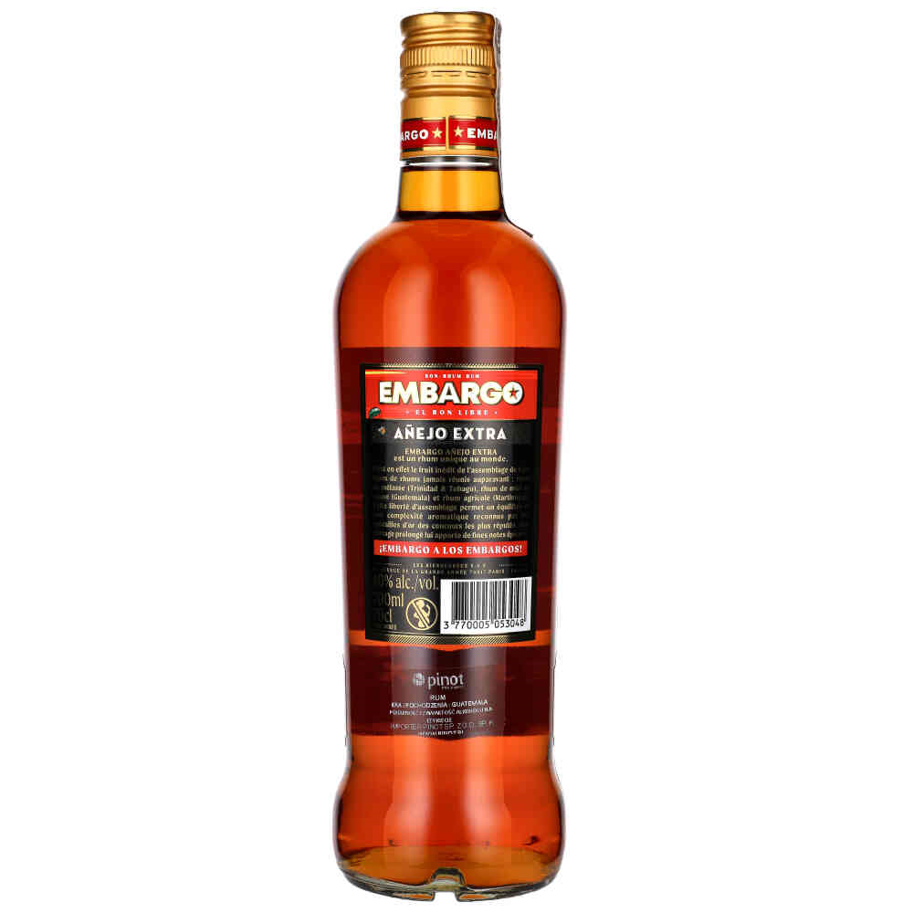 EMBARGO AÑEJO EXTRA Wydłużony proces starzenia w dębowych beczkach, któremu poddawany jest rum, zapewnia wyjątkowo intensywne aromaty. Nuty degustacyjne zapewniają wyczuwalne owoce tropikalne oraz przyprawy, który następnie przechodzą w idealnie zbalansowane podniebienie oraz długie i wyjątkowo delikatne zakończenie.