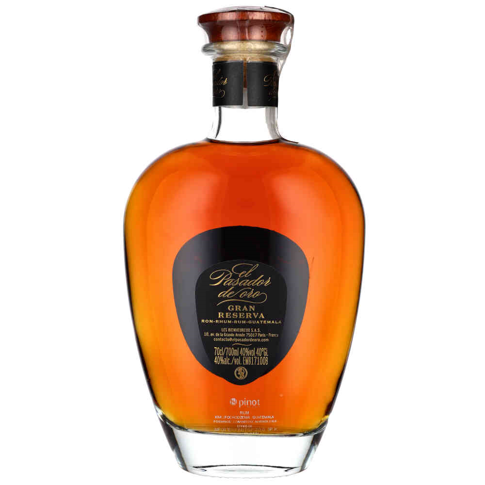 EL PASADOR DE ORO GRAN RESERVA Rum ten wstępnie dojrzewa w Gwatemali, natomiast końcowe starzenie odbywa się w destylarni firmy Les Bienheureux, w pobliżu miejscowości Cognac, w beczkach po koniaku. Zbalansowany aromat kawy i owoców przechodzi w mocny i złożony smak z elementami przypraw, zapewniający wyjątkowo trwały finisz.