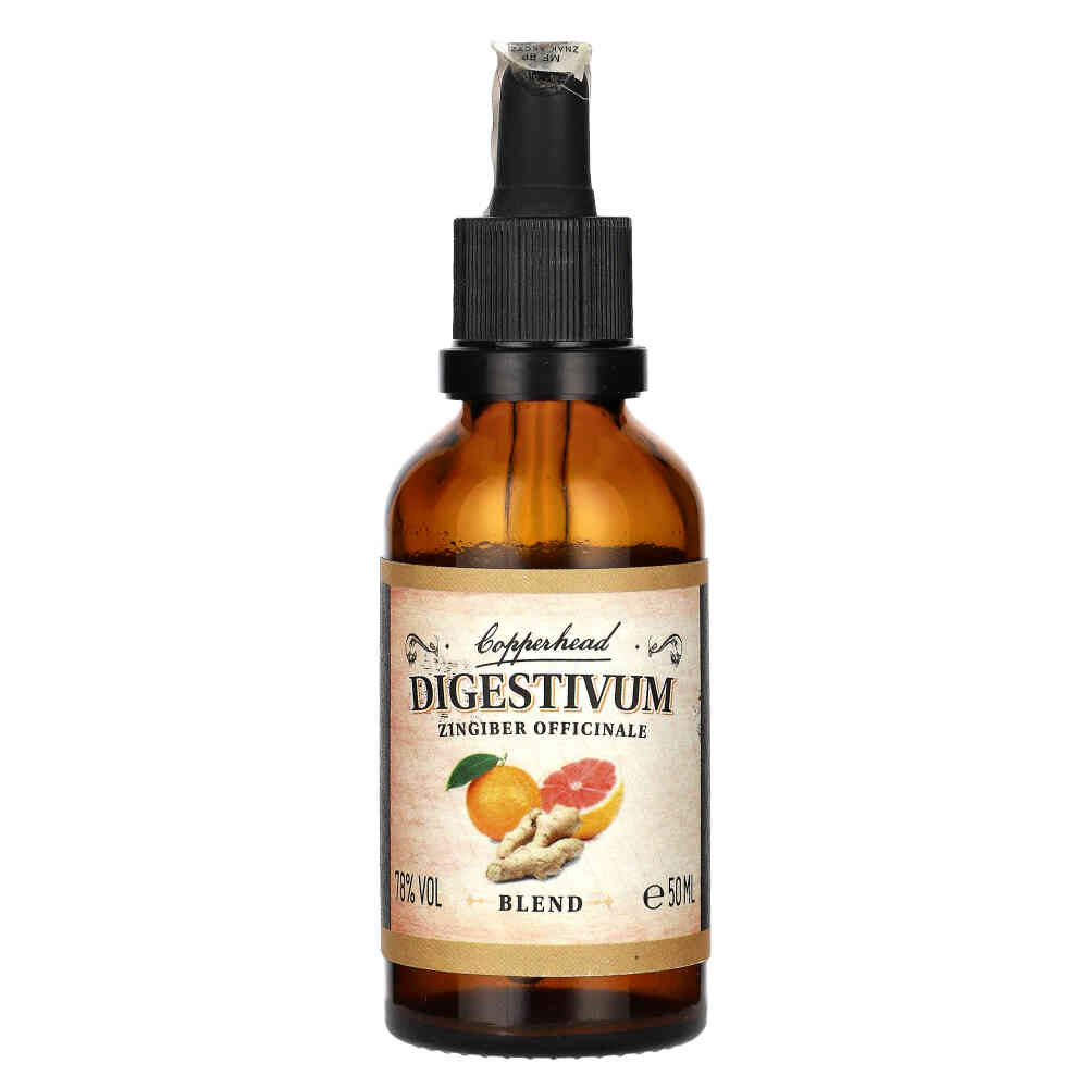 MINIATURKA COPPERHEAD DIGESTIVUM BLEND to intensywny bitters ziołowy o zawartości alkoholu wynoszącej aż 78%. Jest częścią unikalnej serii blendów stworzonych przez Copperhead, zaprojektowanych z myślą o wspomaganiu trawienia, stąd nazwa „Digestivum”. Produkt zawiera naturalne składniki roślinne, w tym imbir. Copperhead Digestivum świetnie sprawdzi się jako dodatek do koktajli, zwłaszcza w połączeniu z ginem, dodając głębokiego, ziołowego aromatu.
