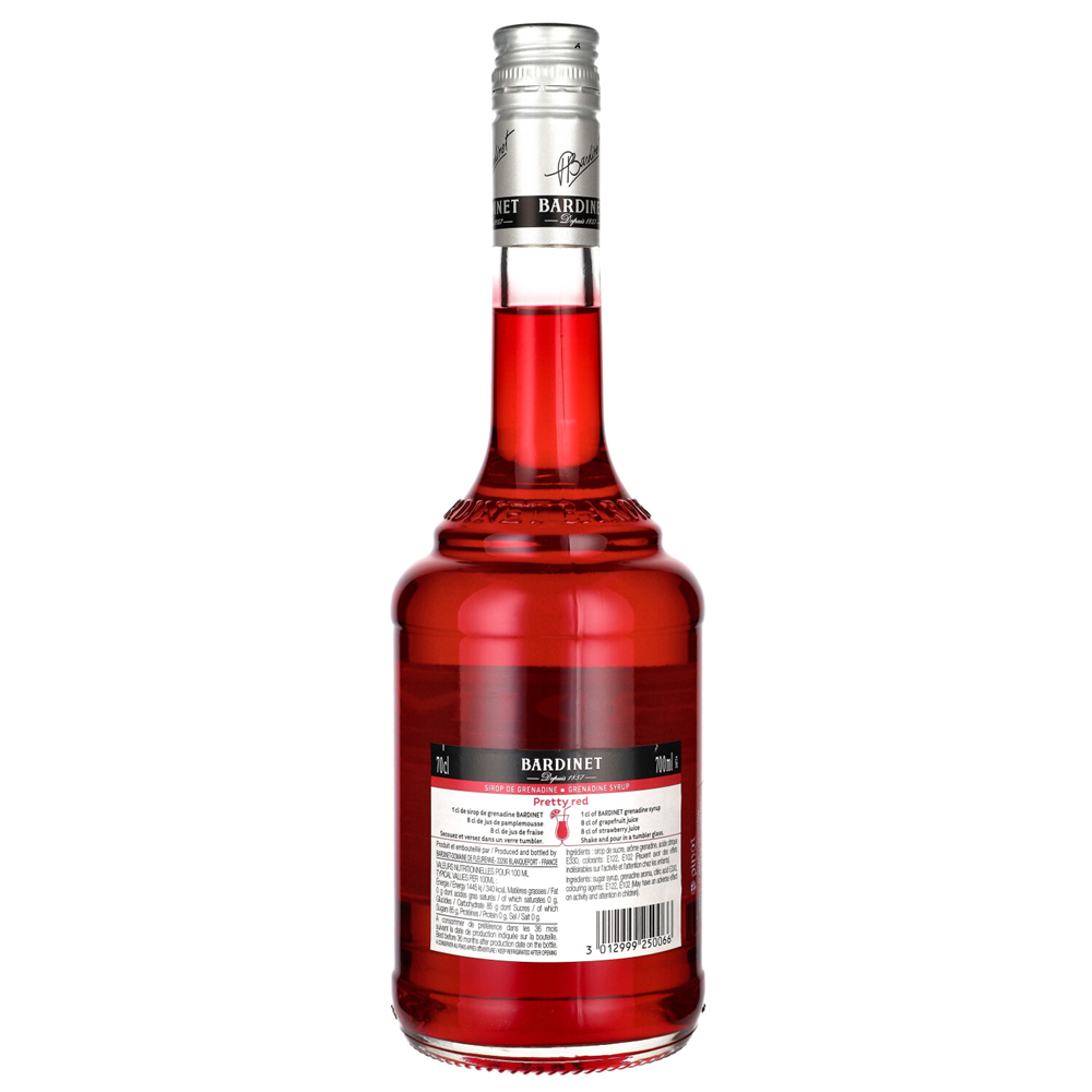 SYROP BARDINET GRENADINE to wysokiej jakości syrop, który dodaje wyjątkowego smaku i koloru do różnorodnych napojów i deserów. Wyprodukowany przez renomowaną francuską markę Bardinet, ten syrop jest znany z intensywnego, owocowego smaku granatu oraz uniwersalności w zastosowaniach kulinarnych i barowych.
