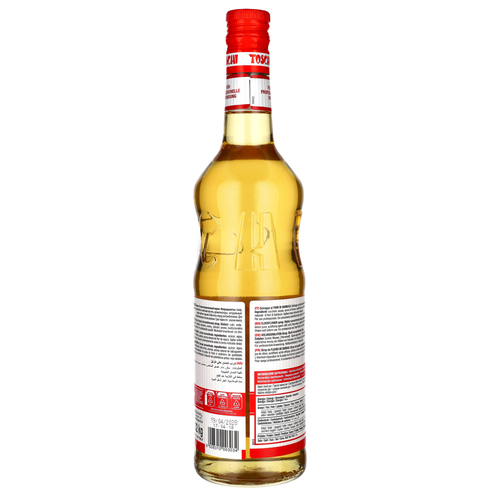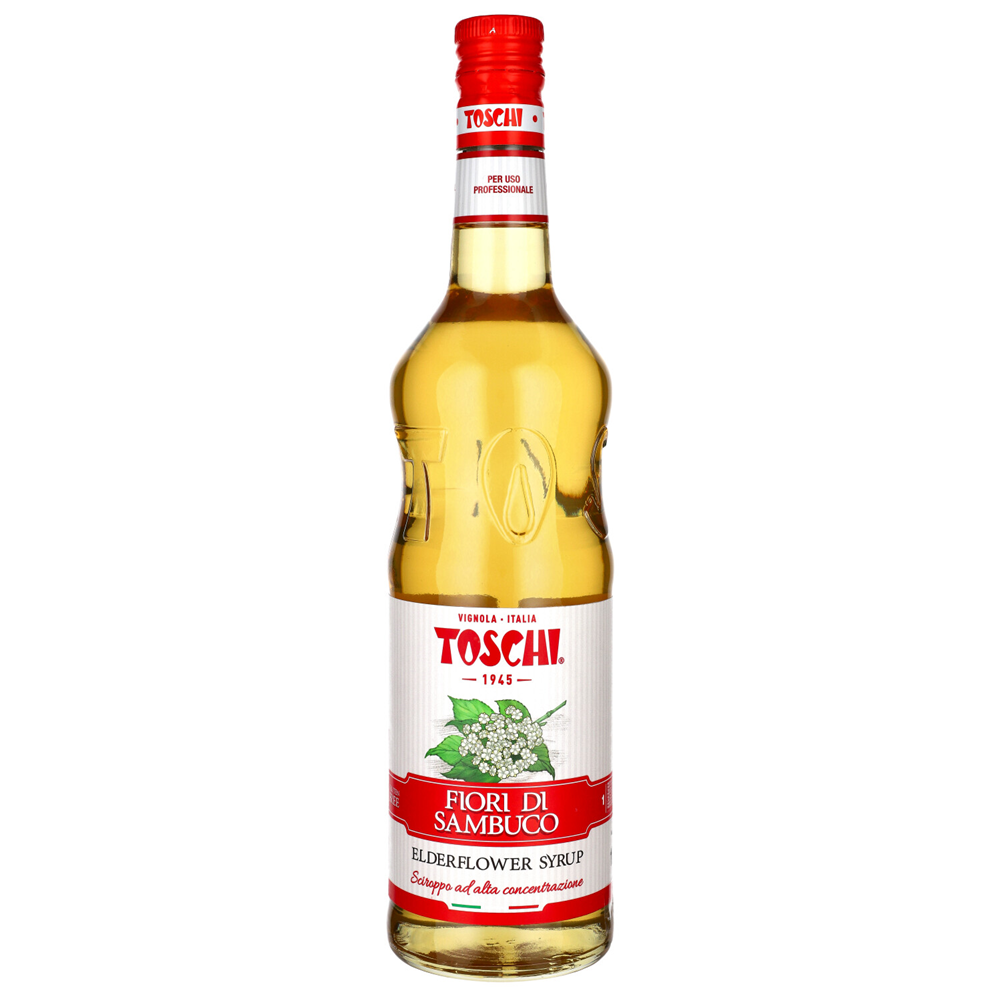 Toschi Syrop Elderflower - syrop z kwiatów czarnego bzu o delikatnym, kwiatowym smaku, idealnie nadający się do nadania subtelnej, aromatycznej słodyczy różnym napojom i potrawom. Jest często stosowany w koktajlach, lemoniadach, herbatach, a nawet deserach, co czyni go wszechstronnym składnikiem zarówno do użytku domowego, jak i profesjonalnego.