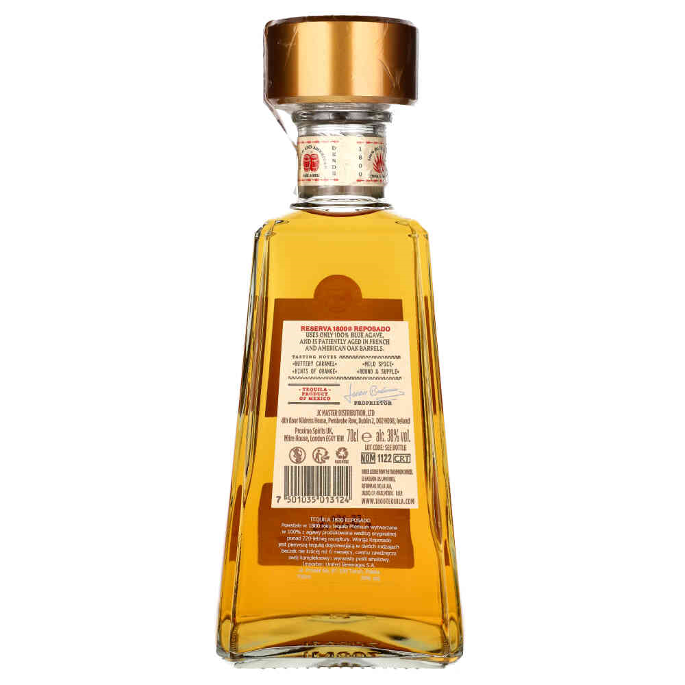 Charakterystyczny kształt butelki nawiązuje do wyglądu piramid budowanych przez rdzennych mieszkańców Meksyku, Majów. W centralnej części butelki znajduje się również herb w którym wyróżnić możemy ową piramidę oraz nazwę 1800, krzyż i inicjały założyciela J. B. Całość spowija wstążka u podstawy której widnieje napis „Trabajo, Pasion, Honestidad” oznaczający praca, pasja i uczciwość. Wersja reposado trafia do beczek z dębu amerykańskiego i francuskiego na okres nie krótszy niż 6 miesięcy.