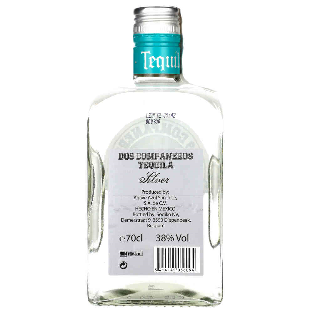 DOS COMPAÑEROS SILVER Wyprodukowana dla belgijskiej firmy Sodiko tequila Dos Compañeros Silver ma wyrazisty charakter z przyjemnie wyczuwalnymi nutami ziemistymi i wapiennymi oraz niuansami agawy w profilu aromatycznym. Z wyglądu krystalicznie przejrzysta o doskonałej strukturze. Na podniebieniu zauważalna ujmująca świeżość owoców cytrusowych