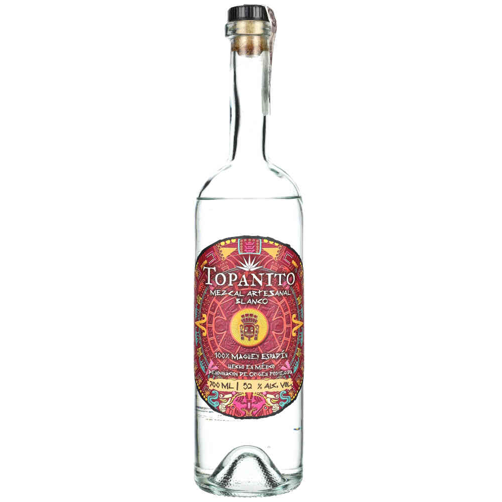 TOPANITO MEZCAL ARTESENAL BLANCO Rzemieślniczy mezcal wykonany w 100% z agawy Espadin. Słodki i bogaty zapach pełen rozmarynu i imbiru wypełnia nos. Na podniebieniu wyczuwalne są smaki chilli, czarnego pieprzu z nieco dymną, lekko paprykową nutą.
