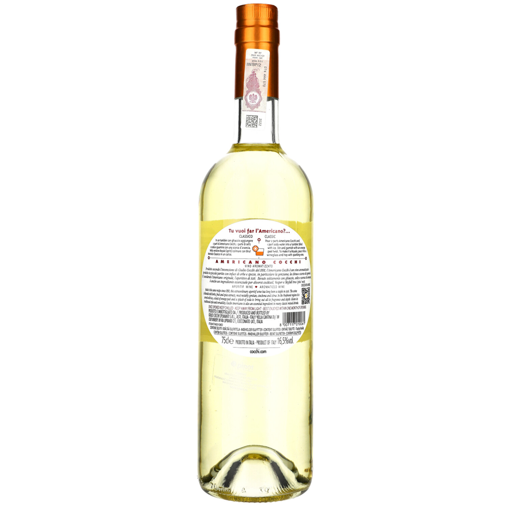 COCCHI AMERICANO BIANCO Cocchi Americano to wino aromatyzowane, stworzone w 1891 roku przez Giulio Cocchi i od tego czasu produkowane nieprzerwanie według oryginalnej receptury. Nazwa „Americano” wywodzi się zarówno z gorzkiego charakteru tego alkoholu („amaricato”), który został osiągnięty przez dodanie ziół i przypraw, jak i amerykańskiego zwyczaju picia wermutu z lodem i sodą. Wytwarzane według oryginalnej receptury Giulio Cocchi, Cocchi Americano jest uznawane w Asti za aperitif par excellence – prawdziwy kawałek historii miasta. Na etykiecie oryginalny futurystyczny kogut zaprojektowany w latach 30-tych i reprezentujący jego funkcję aperitifową („budzi apetyt”), a także jeden z symboli miasta Asti. Cocchi Americano to połączenie wina i ziołowych likierów. Znajdziemy w nim nuty białego wina, cukru, ziół i przypraw, a w szczególności, dzięgiel, chinowiec, skórka gorzkiej pomarańczy, kwiat czarnego bzu.