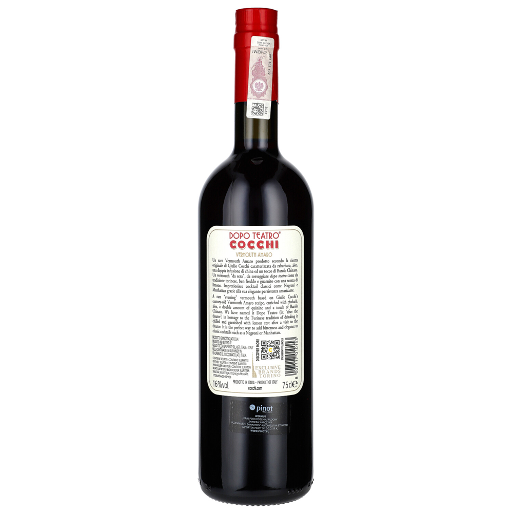 COCCHI AMARO DOPO TEATRO To rzadki „wieczorny wermut” o nazwie Dopo Teatro, nawiązujący do tradycji Piemontu, polegającej na wypiciu małej filiżanki chłodnego wermutu ze skórką cytryny wieczorem, być może po obejrzeniu przedstawienia w jednym z historycznych teatrów stolicy Sabaudii. Wermut Amaro Cocchi został stworzony według oryginalnej receptury Giulio Cocchi, gdzie artemisia została wzbogacona rabarbarem, korą cynamonu, chiretą i podwójnym naparem z chinowca. Dodatek Barolo Chinato do wina bazowego nadaje delikatne czerwone niuanse i dalszą miękką i złożoną nutę – całkowicie w stylu Cocchi.