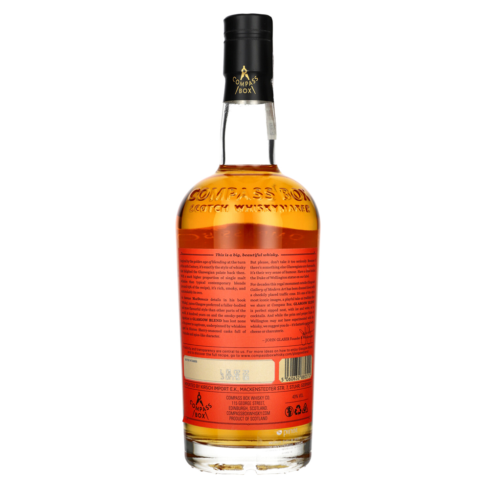 Compass Box Glasgow Blend to nowoczesna interpretacja klasycznego stylu szkockiego blendu, stworzona przez niezależną wytwórnię słynącą z transparentności i wysokiej jakości komponowania. Whisky łączy destylaty z różnych regionów Szkocji, oferując bogaty, a jednocześnie przystępny profil.