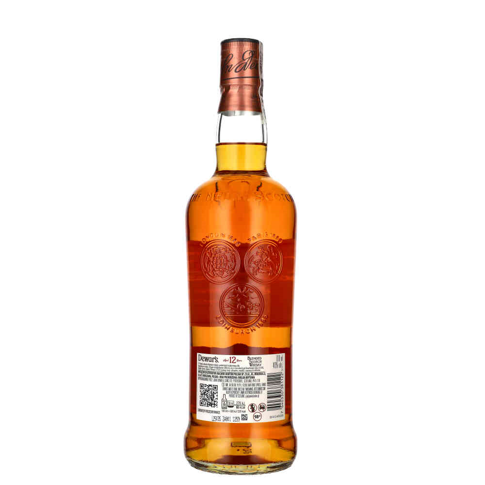 Dewar's 12-letnia Whisky to wyjątkowy trunek o soczystej, złotej barwie, wyróżniający się gładkim i złożonym profilem smakowym. Dzięki procesowi podwójnego dojrzewania łączy w sobie nuty miodu, toffi i wanilii, wzbogacone subtelnymi akcentami kwiatowymi i cytrusowymi. W smaku dominują karmel, wanilia oraz dojrzałe owoce, takie jak jabłka i gruszki, uzupełnione delikatnymi przyprawami, takimi jak cynamon i gałka muszkatołowa. Finisz jest gładki, ciepły i długi, z miękkimi nutami wanilii, miodu oraz lekką taniną dębową.