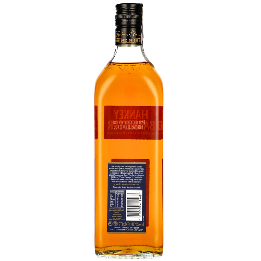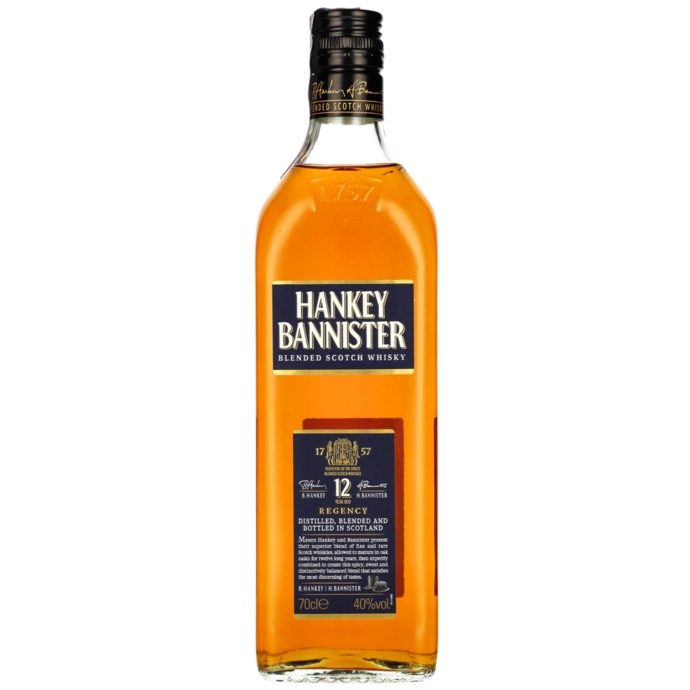 WHISKY HANKEY BANNISTER 12Y to blended whisky dojrzewająca przez 12 lat w amerykańskich beczkach po bourbonie. Zawiera głównie malty z destylarni Speyburn i whisky z Balmenach, z dodatkiem destylatów z Invers House, Balablair, Old Pulteney i Knockdhu. Oferuje słodki, miękki smak z lekkim dymnym akcentem.