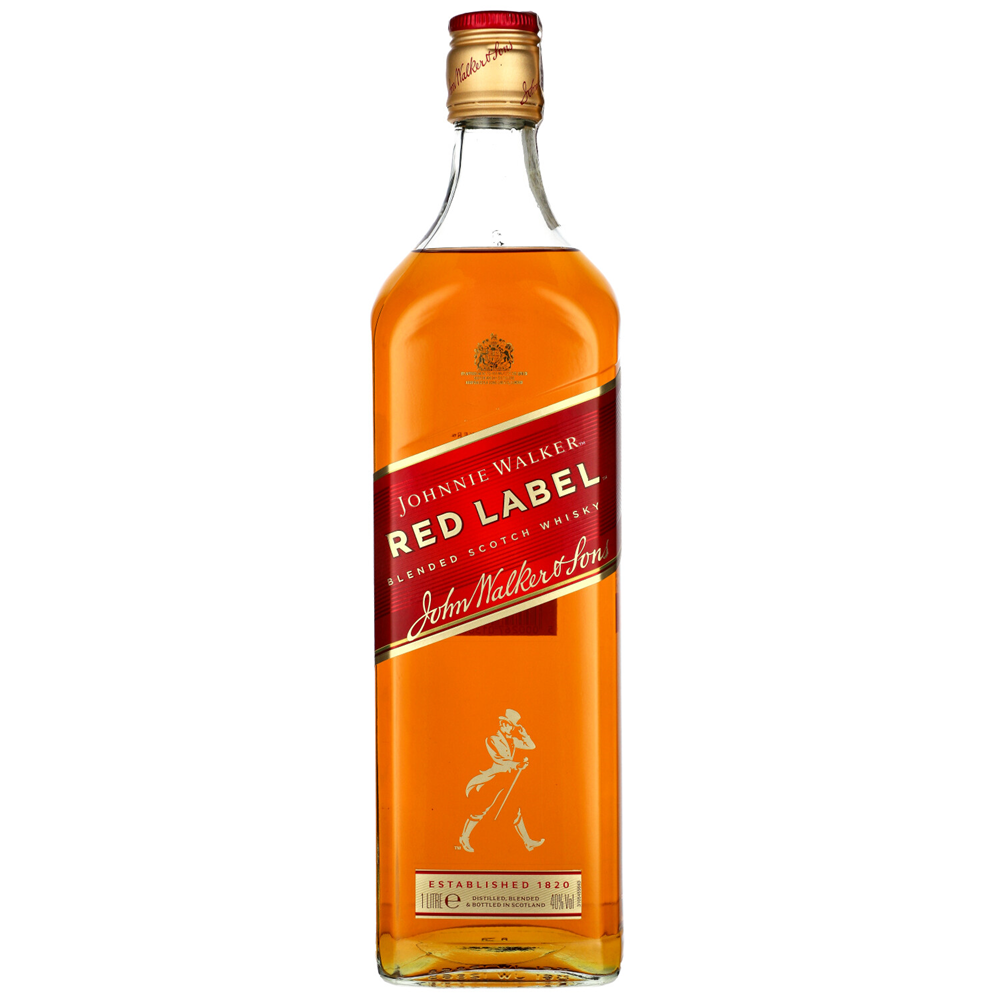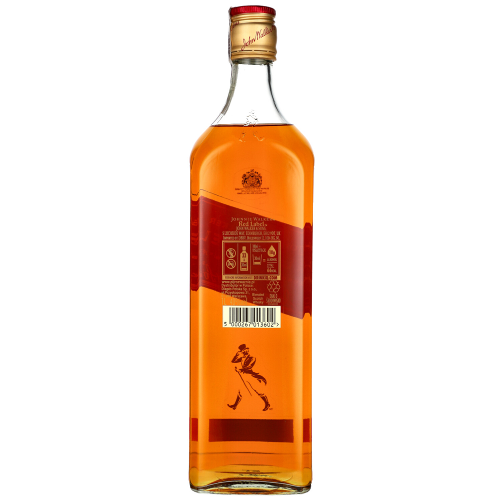 WHISKY JOHNNIE WALKER RED LABEL to whisky o bursztynowym kolorze z jasnymi refleksami. Charakteryzuje się świeżością cytrusów, wyraźnymi nutami cynamonu i czarnego pieprzu, oraz dymnym finiszem z palonego torfu.