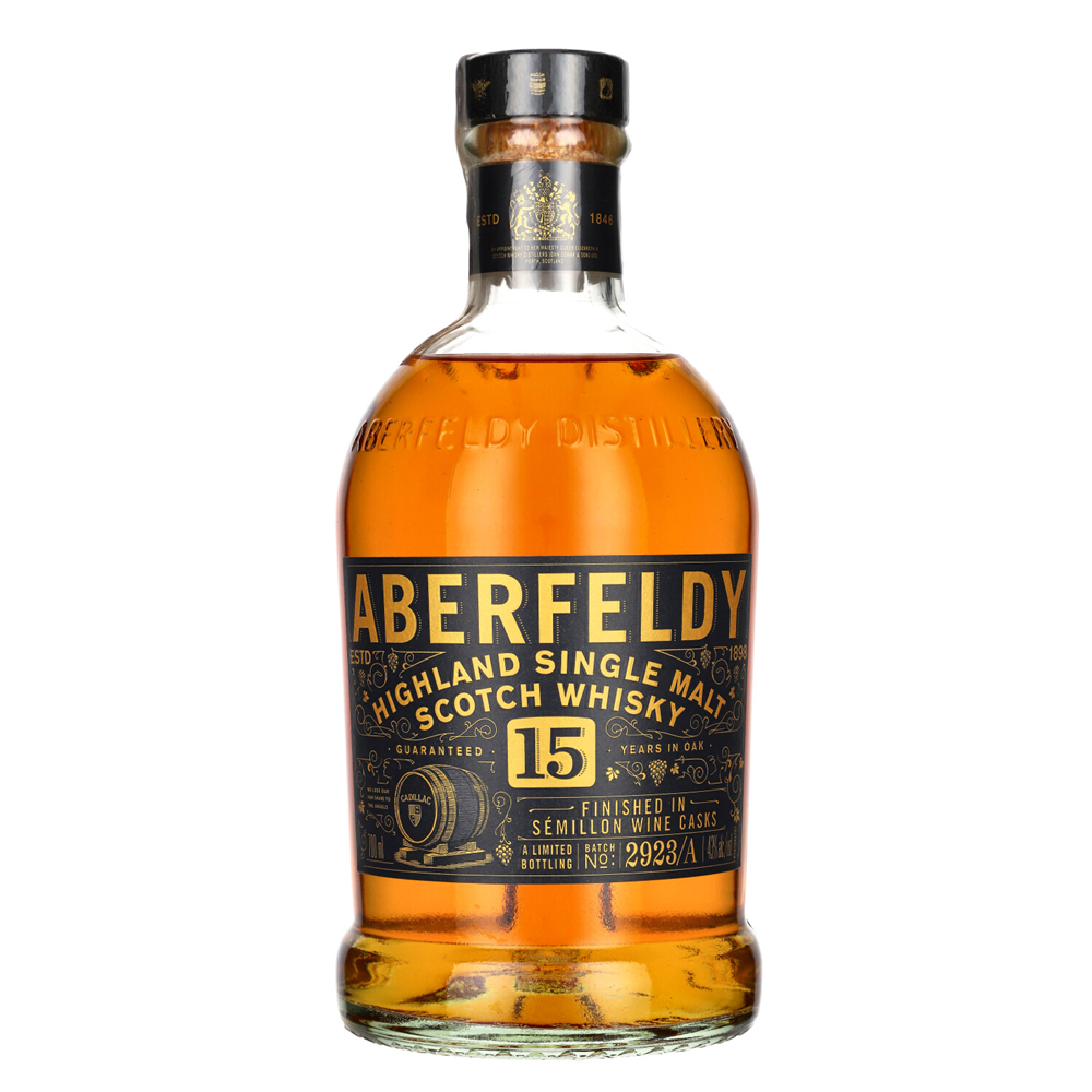 Aberfeldy 15YO to elegancka szkocka whisky single malt, która po klasycznym dojrzewaniu w beczkach ponownego napełnienia została dodatkowo finiszowana przez 6 miesięcy w beczkach po słodkim winie Sémillon z apelacji Cadillac.