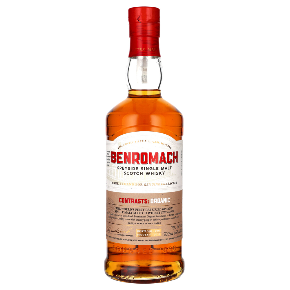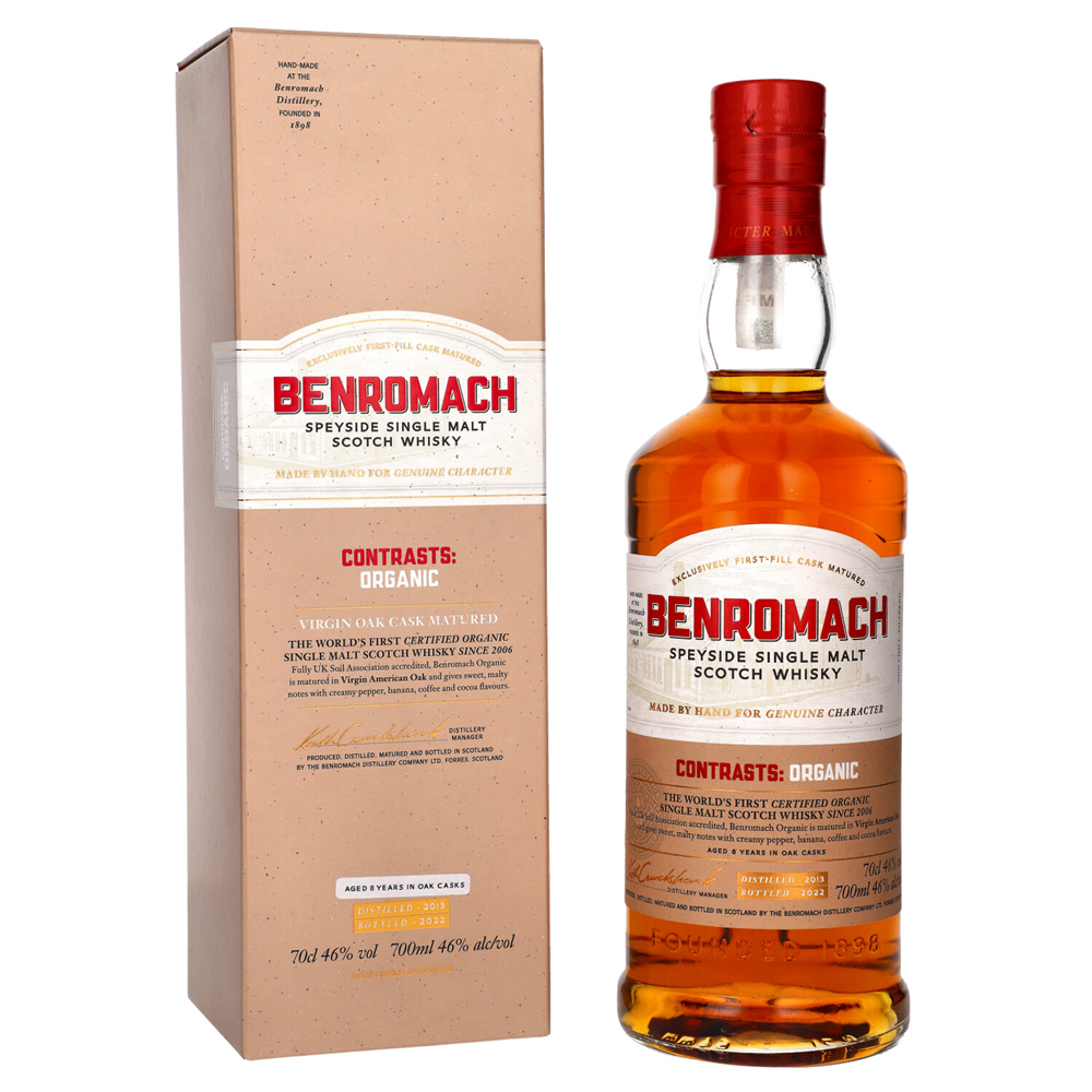 WHISKY SM BENROMACH ORGANIC 2013 to certyfikowana organiczna whisky single malt, produkowana przez destylarnię Benromach w regionie Speyside. Destylowana w 2013 roku, dojrzewała przez około 9 lat w nowych beczkach z amerykańskiego dębu. Jest znana z gładkich i bogatych smaków, które łączą słodkie, słodowe nuty z kremowym pieprzem, dojrzałym bananem oraz subtelnymi akcentami kawy i kakao.