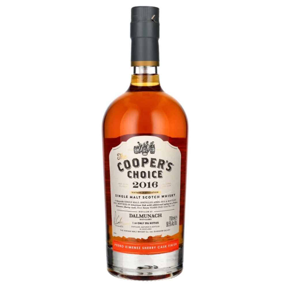 Cooper's Choice Dalmunach 2016 to wyjątkowa whisky single malt, destylowana w 2016 roku i dojrzewająca przez 7 lat w beczkach po sherry Pedro Ximenez. Zabutelkowana z mocą 58,5%, jest to whisky w wersji "cask strength", co oznacza, że nie była rozcieńczana wodą przed butelkowaniem. Co więcej, nie była barwiona karmelem ani filtrowana na zimno, co pozwala zachować pełnię naturalnych smaków i aromatów.