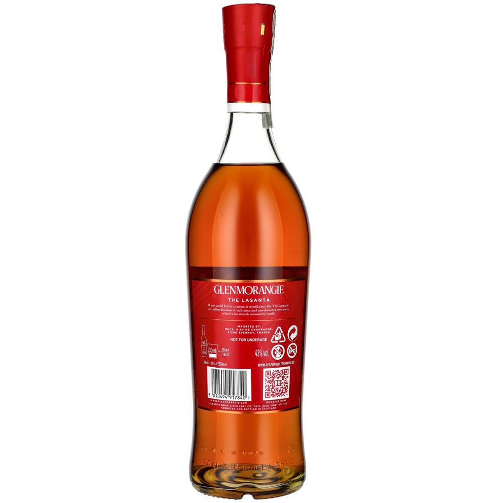 Nieważne gdzie jesteś, w każdym zakątku świata, zachód słońca jest zawsze magicznym doświadczeniem, o czym Dr Bill, zawołany podróżnik, wie doskonale. The Lasanta to próba zabutelkowania tej magii i gdybyś mógł spróbować jak smakuje zachód słońca, przypomniałby właśnie tę whisky. Mieszkanka pięknych odcieni czerwieni i pomarańczy natychmiast przemawia do wszystkich zmysłów. Lasanta rozpoczyna swoje życie w najwyższych alembikach w całej Szkocji, które stworzą wyjątkowo delikatny i aromatyczny spirytus. Po dwunastu latach dojrzewania w beczkach po Bourbonie i sherry przemieni się w swoistą burzę soczystych, słodkich owoców i pikanterii. Następnie przychodzą nuty rodzynek, gęstego miodu, orzechów w czekoladzie i świeżo startego cynamonu. Zawsze kiedy oglądasz zachód słońca dostrzegasz coś innego. Tak samo gdy pijesz Glenmorangie Lasanta. Kluczowe aromaty: miód, czekolada, cynamon, rodzynki.