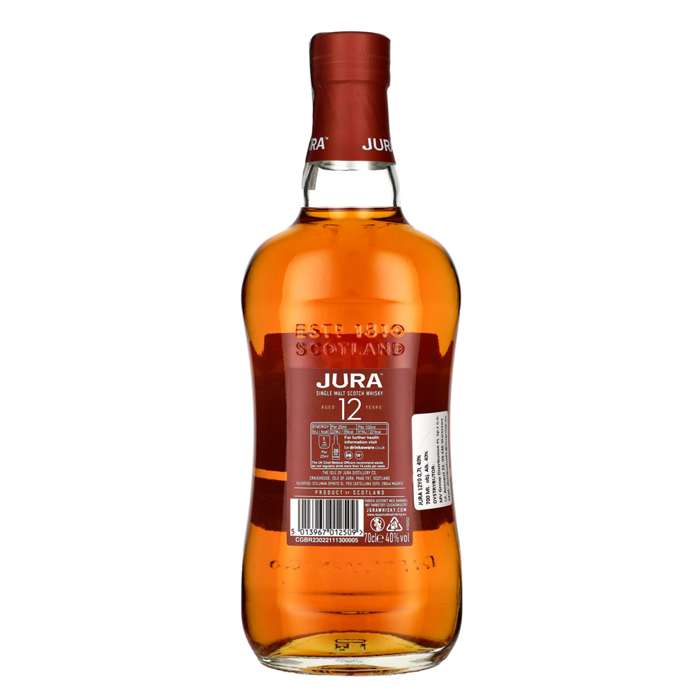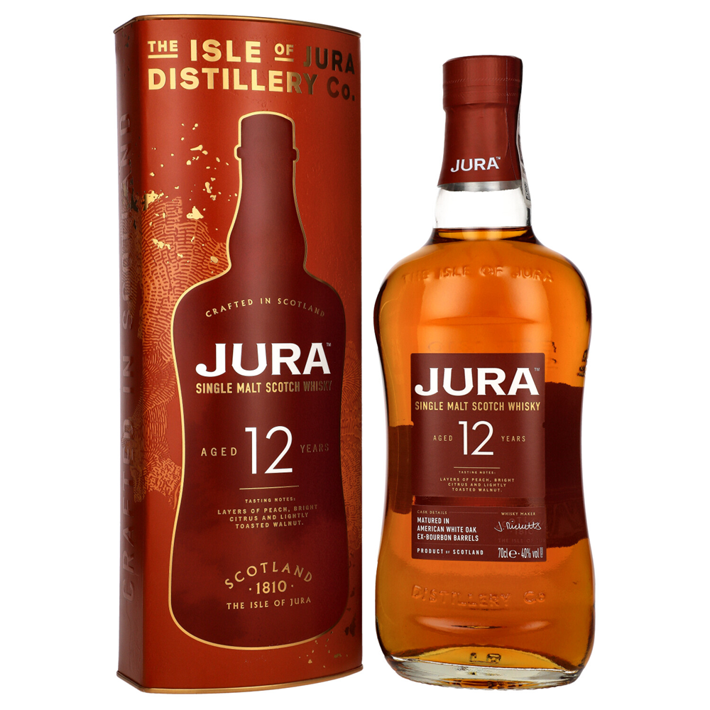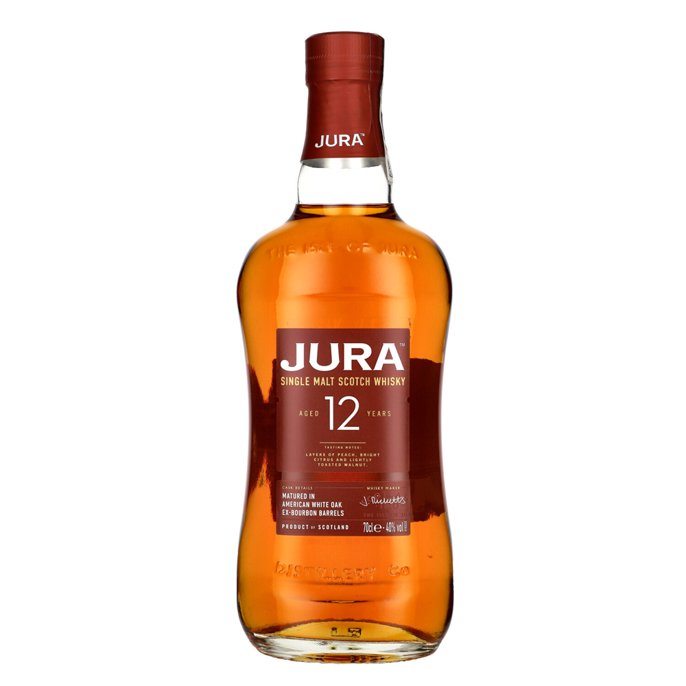 Jura 12-letni Single Malt - szkocka whisky z wyspy Jura, leżakowana w beczkach z amerykańskiego dębu i finiszowana w sherry Oloroso. Aromat owocowo-słodki z nutami wanilii, karmelu, brzoskwini i rodzynek, smak bogaty i złożony – płatki z miodem, mleczna czekolada, pieczone jabłka i orzechy włoskie. Finisz średnio długi, z owocową słodyczą, solonymi orzeszkami i subtelną nutą dębu.