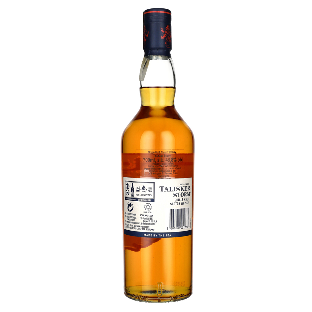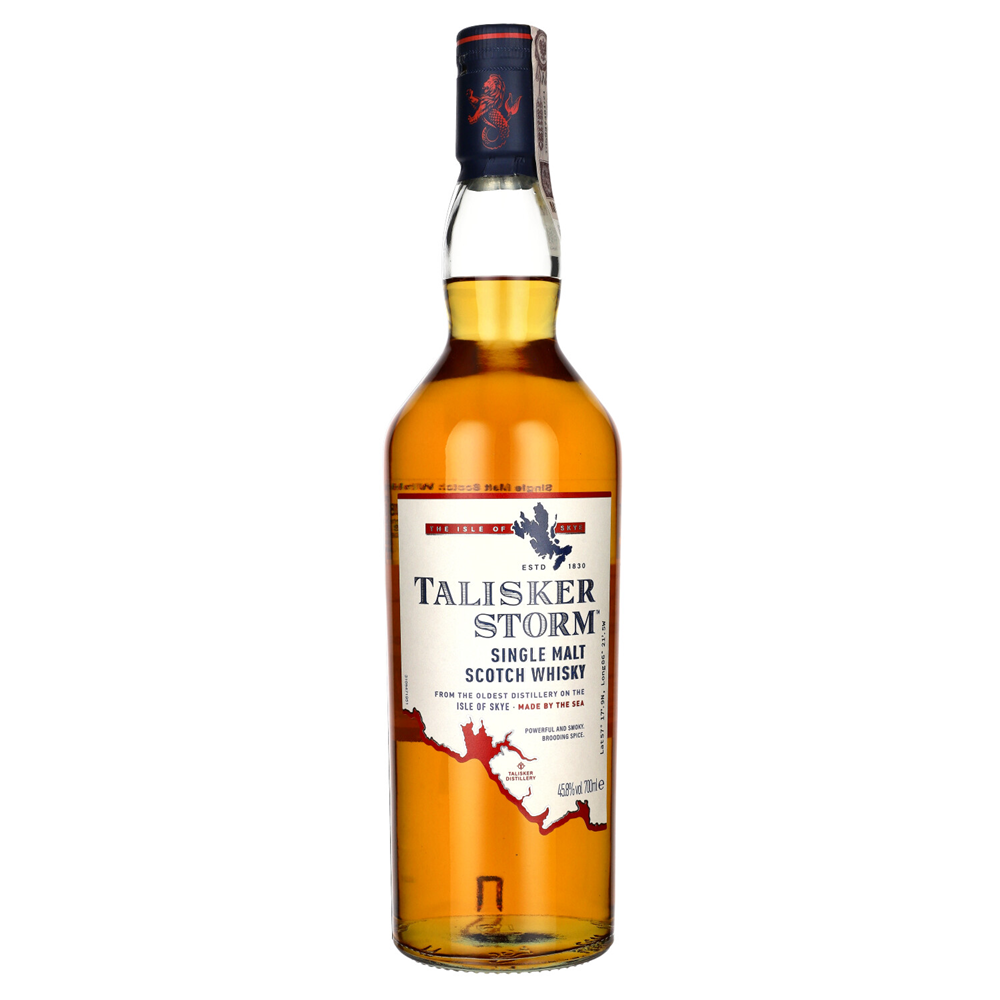Talisker Storm „Smoky & Powerful” to intensywna szkocka single malt z wyspy Skye, stworzona z myślą o podkreśleniu charakterystycznego dla destylarni torfowo-dymnego stylu. Dzięki wykorzystaniu destylatów dojrzewających częściowo w ponownie wypalanych beczkach, whisky zyskuje większą głębię i wyrazistość.