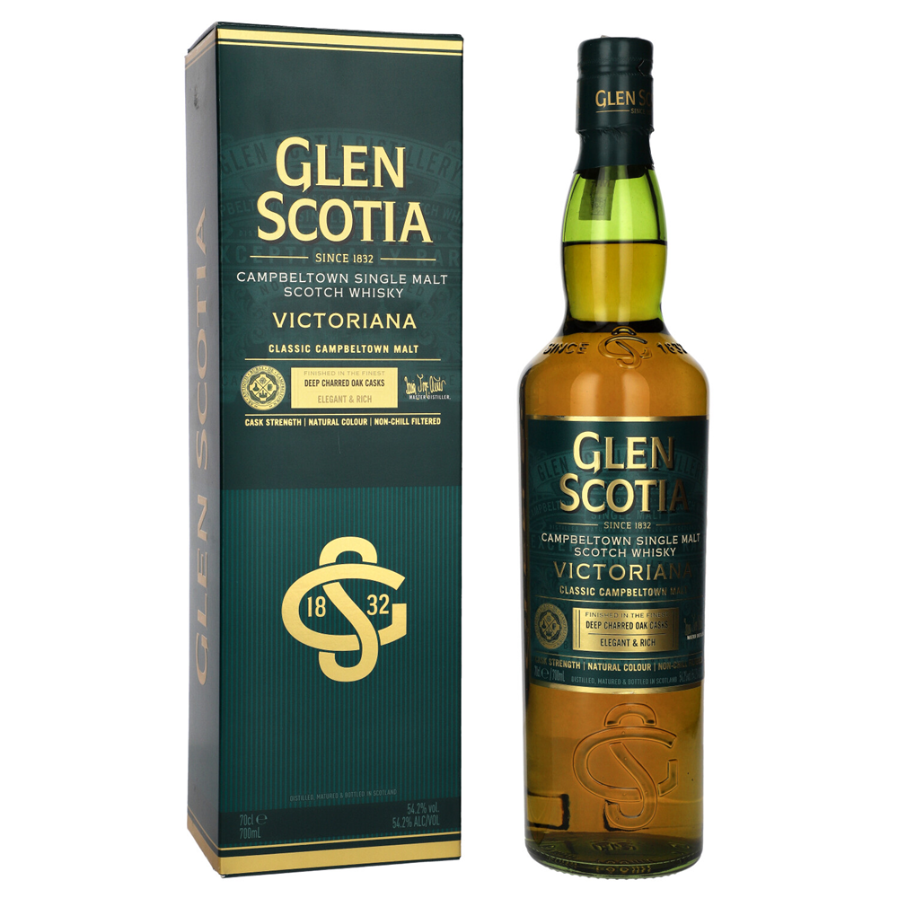 Glen Scotia Victoriana to wyrazisty single malt z regionu Campbeltown, butelkowany z mocą 54,2% alkoholu. Dojrzewa w beczkach po amerykańskim bourbonie, a następnie finiszowany jest w beczkach po sherry Pedro Ximénez (PX), co nadaje mu głębię, słodycz i intensywnie czekoladowy charakter.