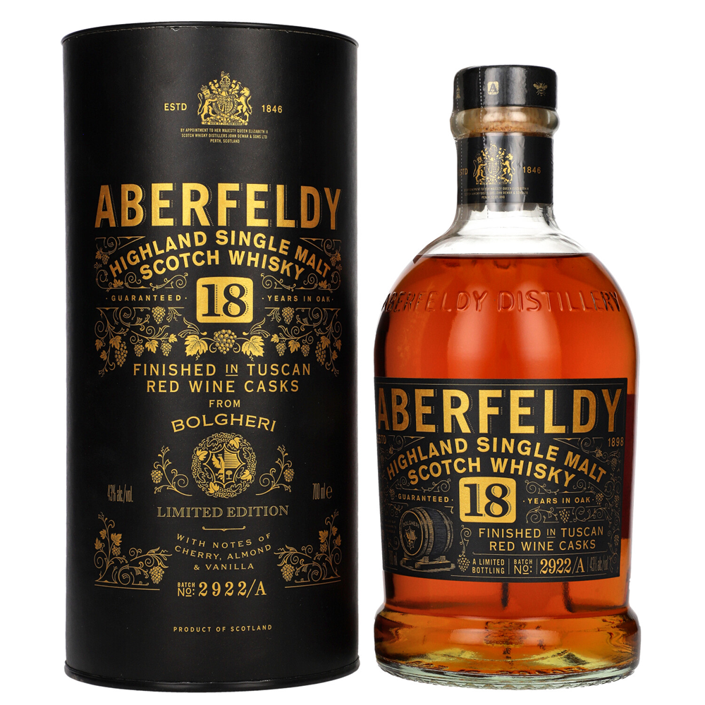 Aberfeldy 18YO Bolgheri Red Wine Cask Finish to elegancka szkocka whisky single malt z regionu Highland, dojrzewająca przez 18 lat w dębowych beczkach, a następnie finiszowana w beczkach po czerwonym winie z toskańskiego Bolgheri.