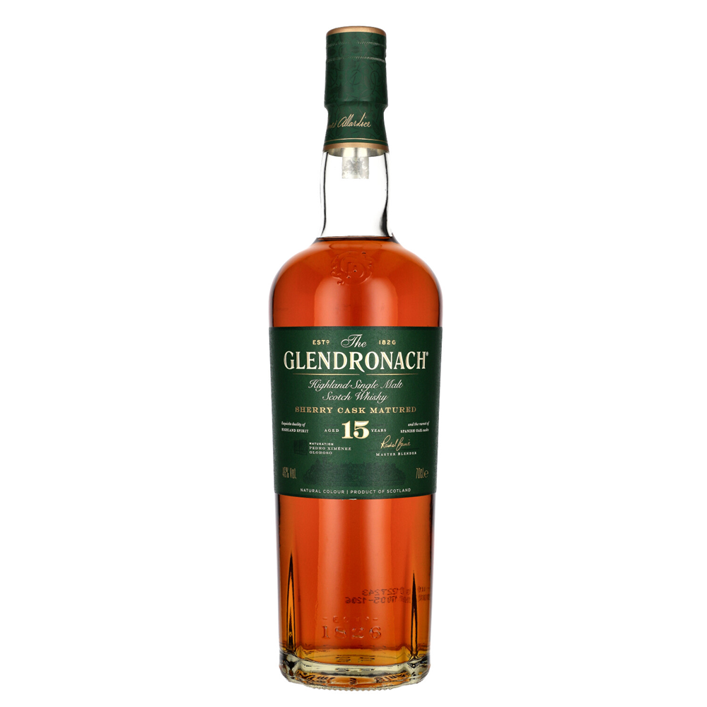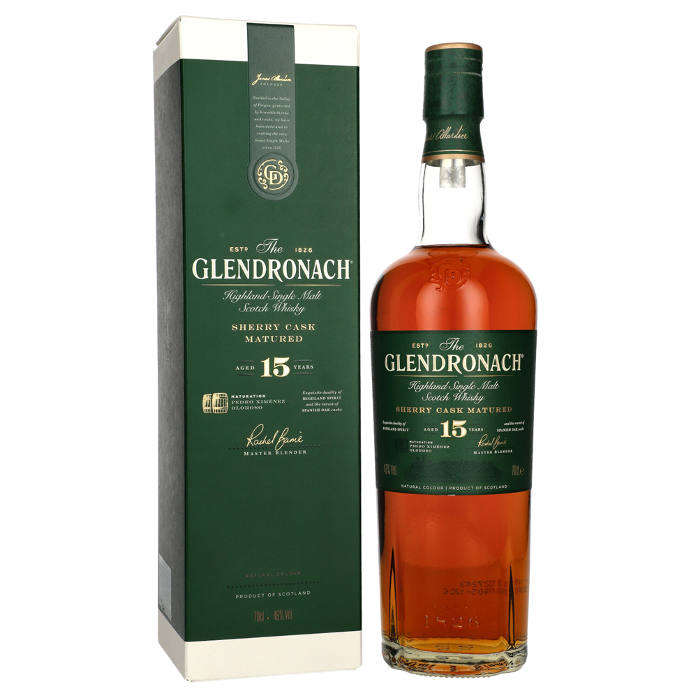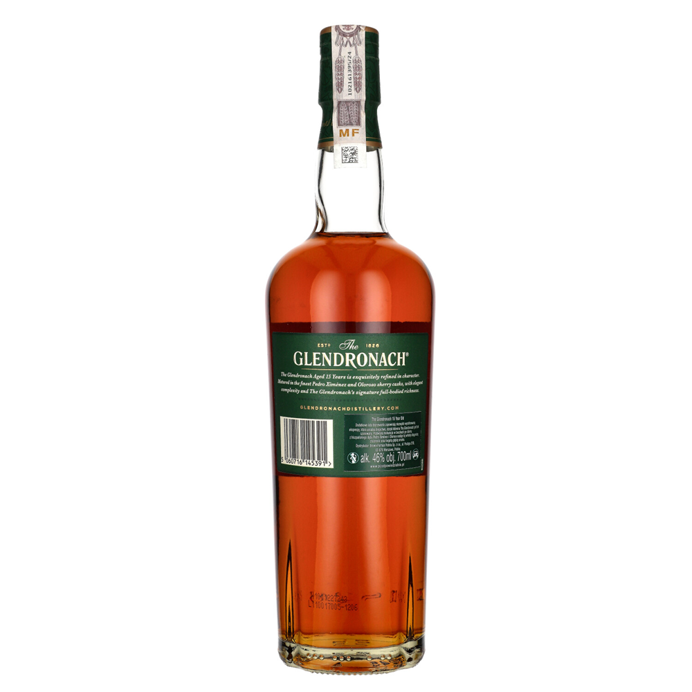 Glendronach 15y to whisky o głębokiej, złoto-mahoniowej barwie i niezwykle bogatym charakterze. W aromacie zachwyca intensywną słodyczą syropu toffi i nutami pomarańczowej czekolady. Smak jest pełny i wielowymiarowy – wyczuwalne akcenty kawy, czekolady oraz korzennych pierników długo utrzymują się na podniebieniu. Finisz stanowi prawdziwą ucztę dla zmysłów, potwierdzając klasę tej edycji. Powstała z inicjatywy Billy’ego Walkera, który po przejęciu destylarni w 2008 roku przywrócił ją do życia, tworząc odrodzoną, 15-letnią whisky dojrzewającą w beczkach po sherry.