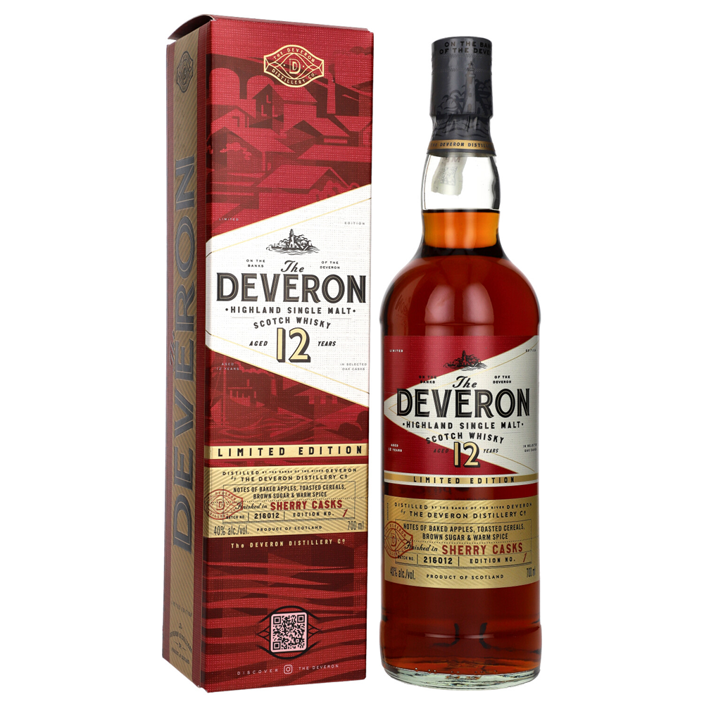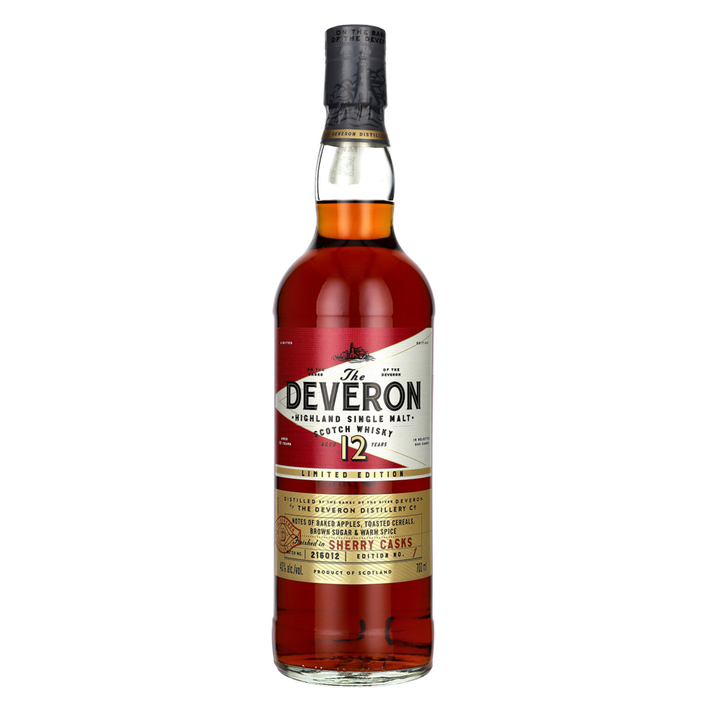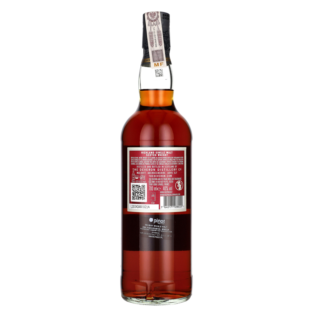 The Deveron 12 YO Sherry Cask Whisky 40% to limitowana edycja 12-letniej whisky finiszowanej w beczkach po sherry, które nadają jej głębszy, owocowo-karmelowy charakter. Dominuje słodycz czerwonych owoców, toffi i delikatnej czekolady, a całość pozostaje harmonijna i łagodna.