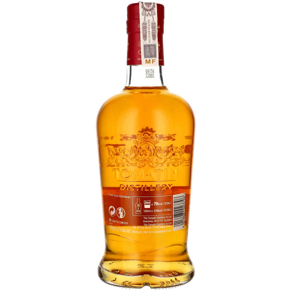 Finisz jest długi i intensywny, pozostawiając trwałe nuty laski wanilii oraz kruchych krówek, które delikatnie rozpływają się na podniebieniu. Tomatin Cask Strength Bourbon & Sherry to prawdziwa gratka dla koneserów, którzy cenią sobie zarówno wyraziste aromaty, jak i zbalansowaną strukturę smakową.