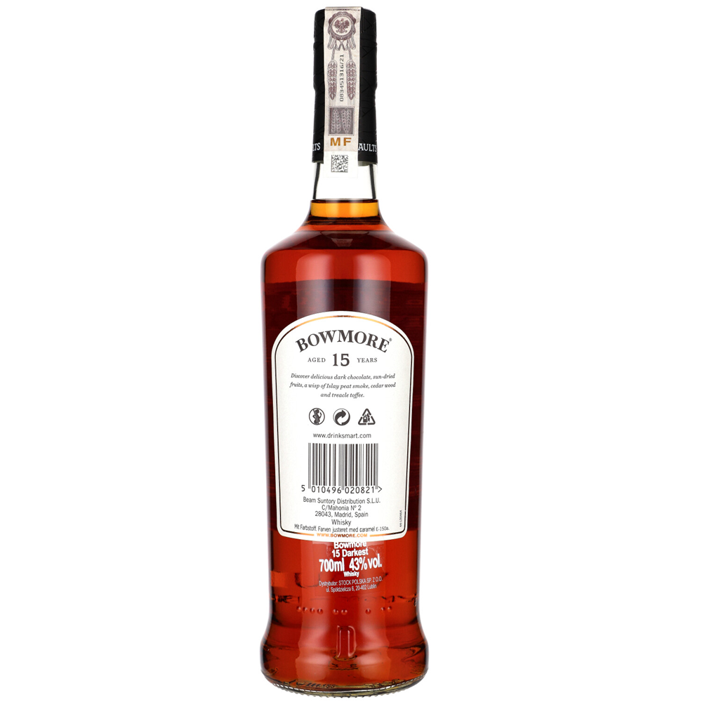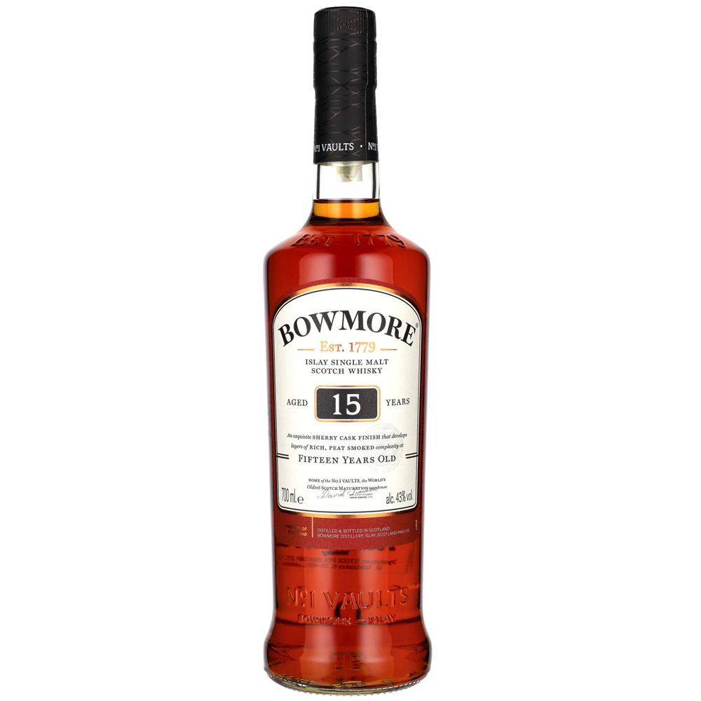 WHISKY SM BOWMORE 15YO dojrzewana najpierw w beczkach po bourbonie, a następnie w beczkach po sherry Oloroso.To właśnie ostatnie trzy lata spędzone w beczkach po Oloroso nadają jej bogaty, głęboki kolor i intensywny, rozgrzewający finisz.
