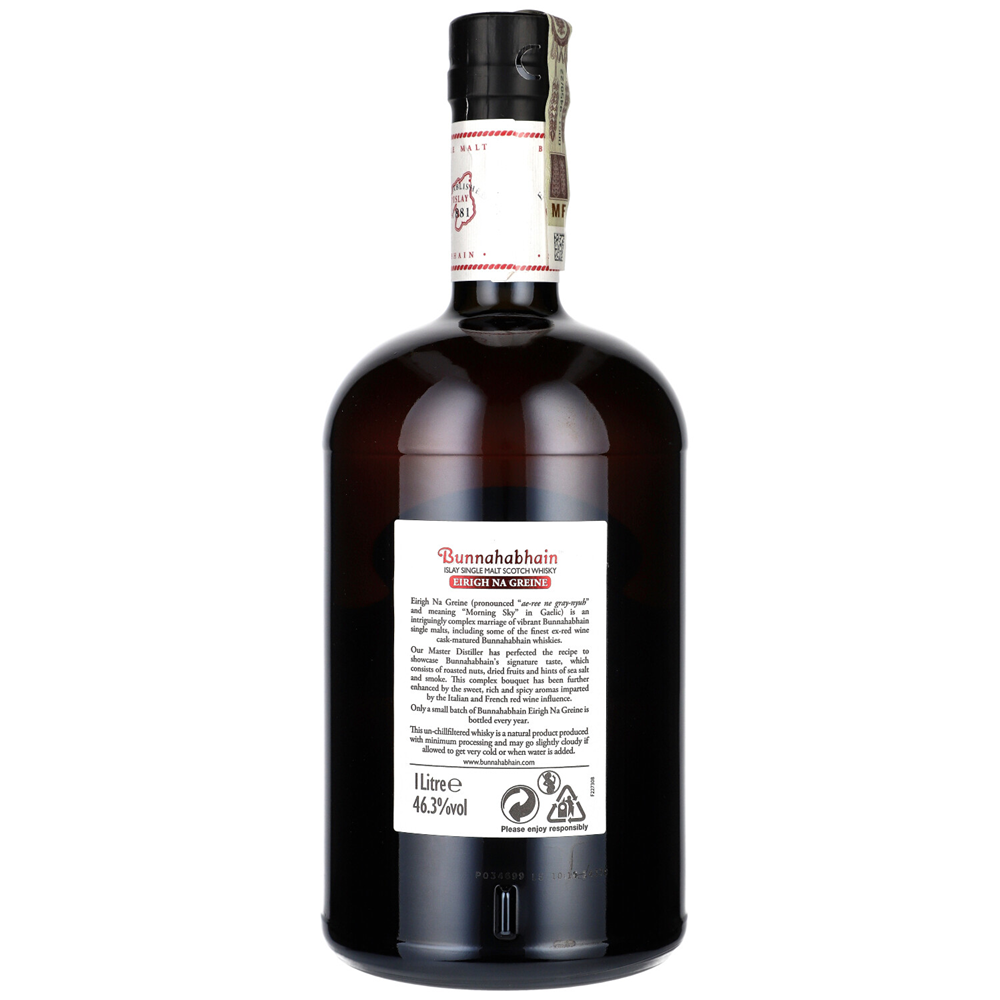 WHISKY SM BUNNAHABHAIN EIRIG NA GREINE - to wyjątkowy trunek o charakterystycznym profilu smakowym, który łączy nuty prażonych orzechów i owoców z solą morską i dymem, wzbogacony słodkimi aromatami beczek po czerwonym winie.