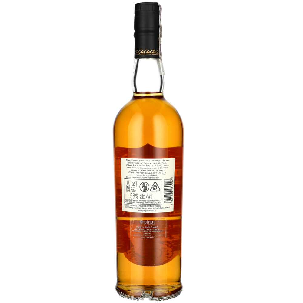FINLAGGAN ORIGINAL CASK STRENGTH Prawdziwie naturalna whisky, nierozcieńczana, niebarwiona karmelem, niefiltrowana na zimno. Komponowana w małych partiach 15-20 beczek. W aromacie dym torfowy i wędzonka, przeplecione starą skórą. Smak słodko-dymny, morska bryza, jodyna i cytrusy. Finisz długi, rozgrzewający popiół, sadza oraz torf.