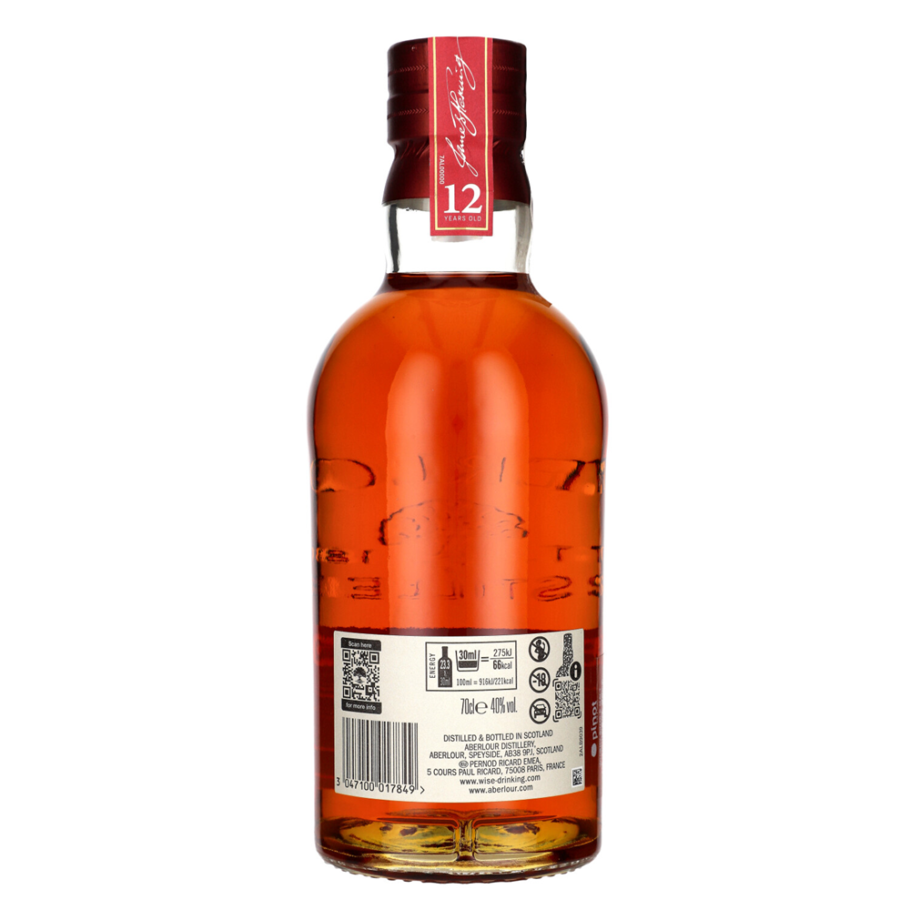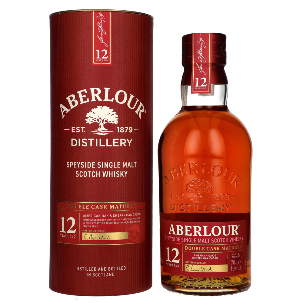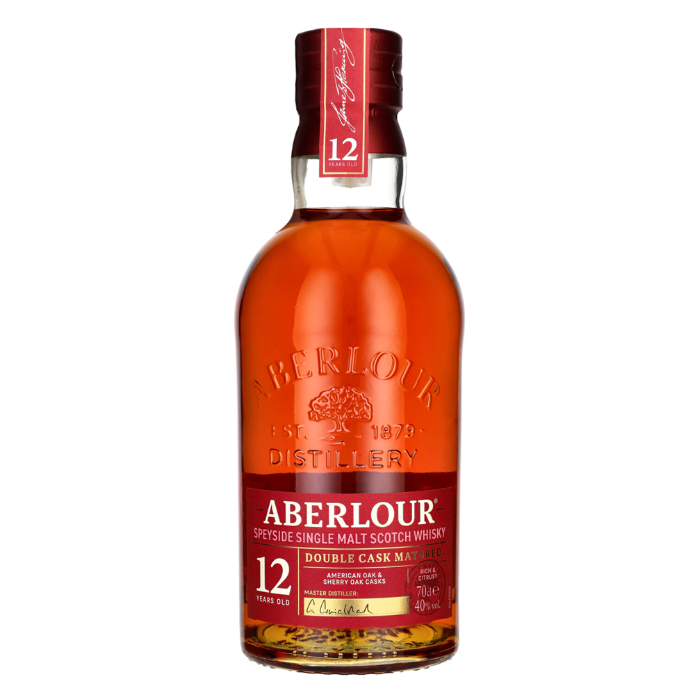 Dwunastoletnia whisky stanowiąca doskonały przykład, jak wyjątkowo świeży, cytrusowy, surowy spirytus Aberlour nabiera łagodniejszego smaku dzięki starzeniu w dwóch różnych beczkach. Do dojrzewania stosowane są tradycyjne beczki dębowe i beczki typu butt, by stworzyć subtelnie zrównoważony smak tego wyrafinowanego alkoholu.