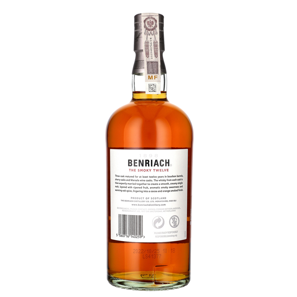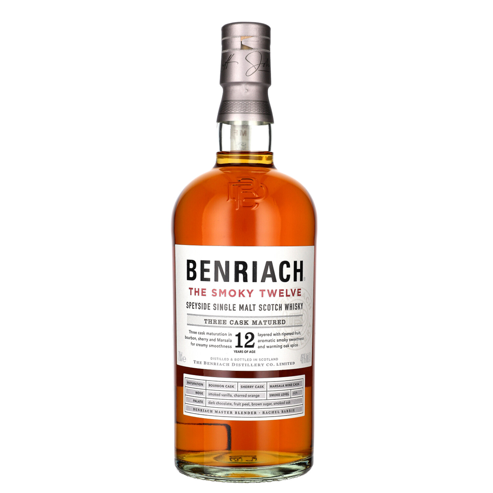 WHISKY SM BENRIACH 12YTHE SMOKY TWELVE - Speyside single malt whisky o wyrazistym, dymnym charakterze. Dojrzewająca minimum 12 lat w trzech rodzajach beczek (bourbon, sherry, marsala), zachwyca kremową teksturą i złożonym profilem smakowym.
