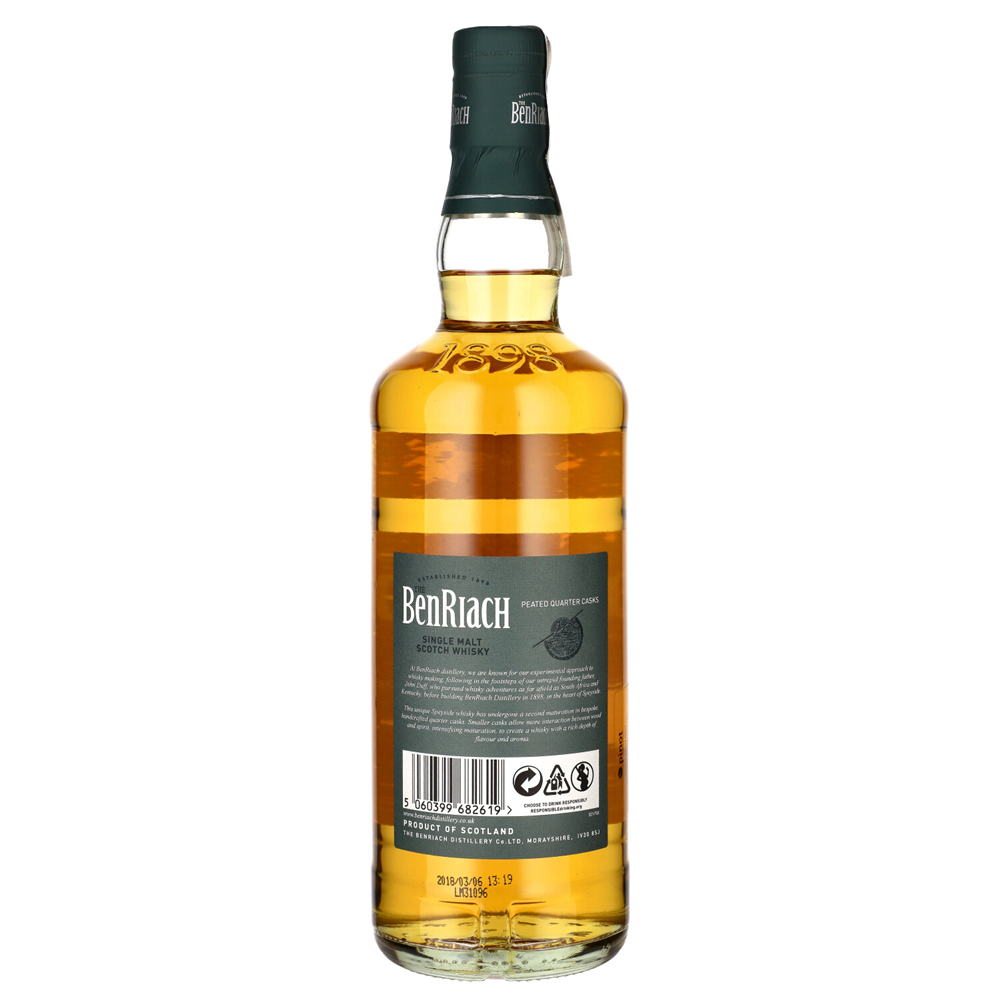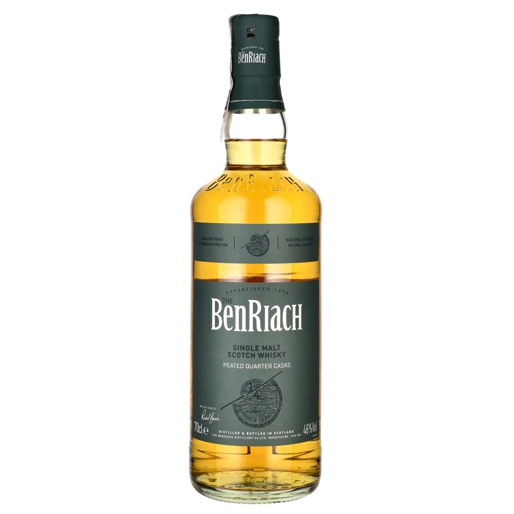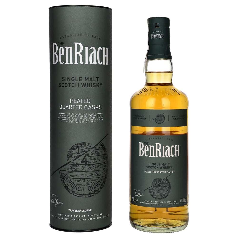 Benriach Peated Quarter Cask 46% to wyjątkowa whisky single malt, która wyróżnia się połączeniem owocowych i ziołowych nut z wyraźnym torfowym tłem, charakterystycznym dla destylarni Benriach. Whisky dojrzewała w mniejszych beczkach typu „quarter cask”, co przyspieszyło proces maturacji i pozwoliło na intensywniejszą wymianę smaku z drewnem. Dodatkowo, nie była poddawana filtracji na zimno, co zachowało pełnię jej naturalnego charakteru.