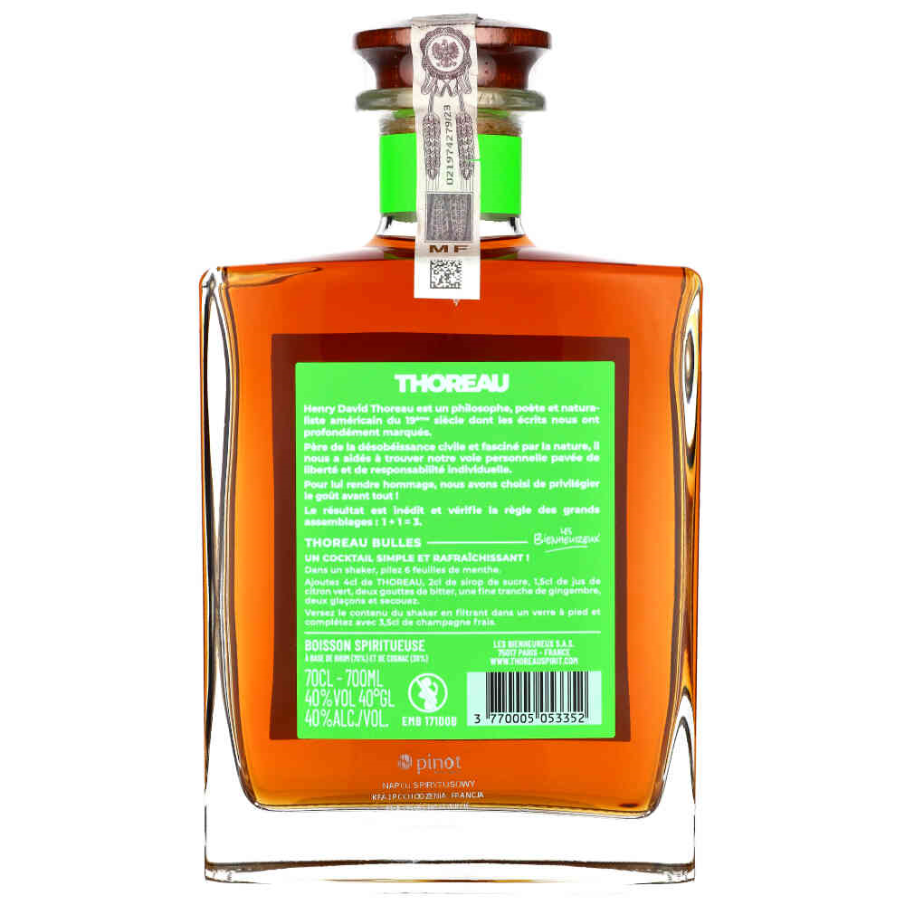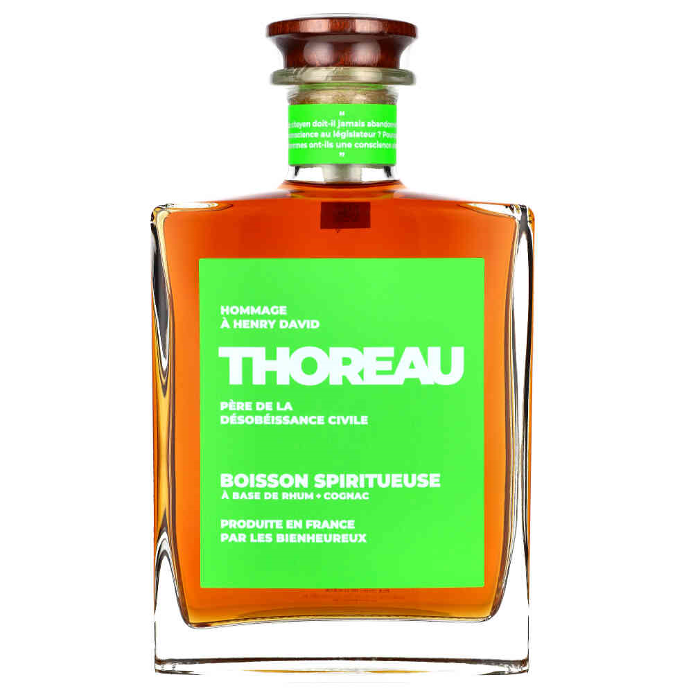 THOREAU Thoreau powstał jako hołd dla XIX-wiecznego amerykańskiego filozofa, poety i przyrodnika Henry・ego Davida Thoreau, którego twórczość rozbudziła w zespole Les Bienheureux niepochamowaną chęć wyrażania swojej wolności do innowacji. Trunek ten stanowi wyjątkowe połączenie składające się w 70% z gwatemalskiego rumu oraz w 30% z koniaku V.S.O.P. Egzotyczne aromaty rumu z wyczuwalnymi bananami i „crème brûlée・ łączą się z gorzkimi pomarańczowymi nutami koniaku, aby na końcu uzyskać wyjątkowo trwały finisz z elementami suszonych owoców.