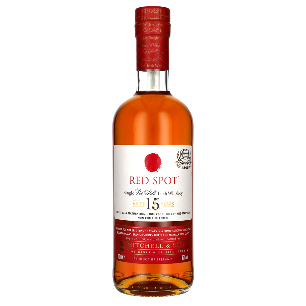 Red Spot 15 Years to irlandzka whisky single pot still, trzykrotnie destylowana i dojrzewająca przez 15 lat w beczkach po bourbonie, sherry oraz winie Marsala. Charakteryzuje się bogatym bursztynowym kolorem ze złotymi refleksami.