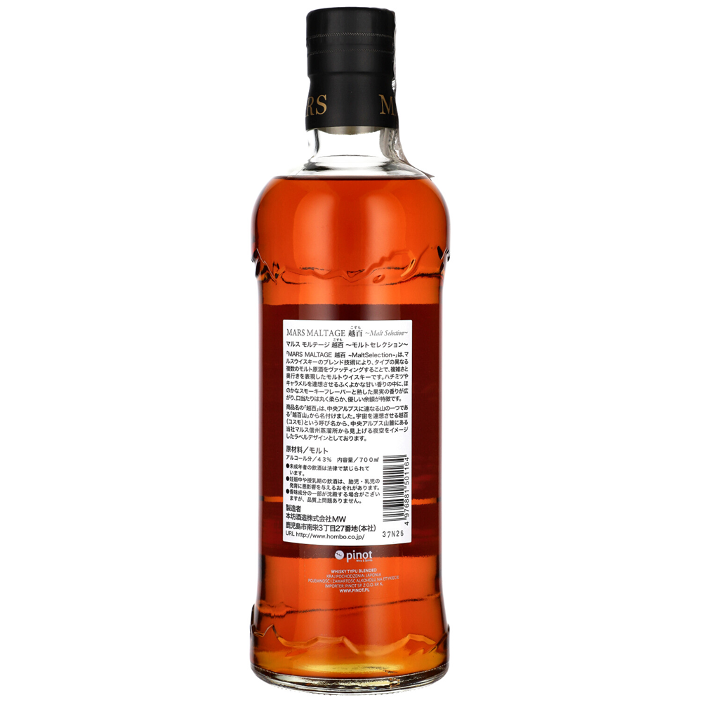 Mars Maltage „Cosmo” to wyjątkowa blended malt whisky, która harmonijnie łączy w sobie najlepsze elementy japońskiego rzemiosła i szkockiej tradycji. Zawiera destylaty z japońskiej destylarni Shinshu oraz starannie wyselekcjonowane single malty ze Szkocji. Od momentu debiutu na Tokyo International Bar Show w 2015 roku, „Cosmo” zdobyła uznanie koneserów na całym świecie.