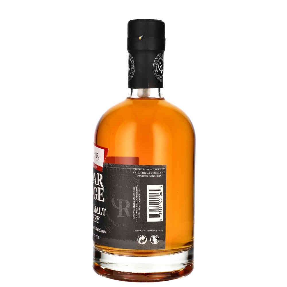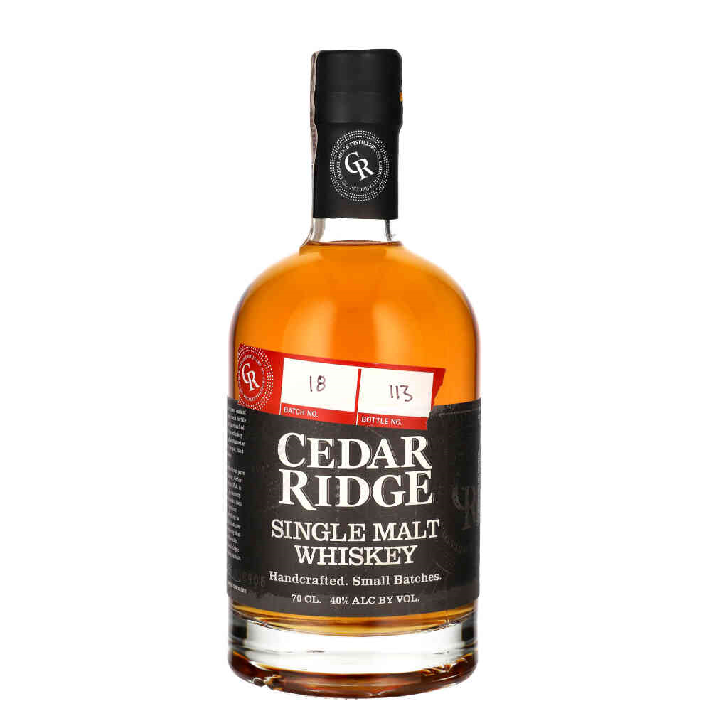 Cedar Ridge Single Malt Whiskey to wyjątkowy trunek z destylarni Cedar Ridge w Iowa, USA, który łączy w sobie bogactwo smaków i subtelne aromaty. Butelkowany z mocą 40% alkoholu, jest wytwarzany wyłącznie z jasnego jęczmienia i dojrzewa w różnorodnych dębowych beczkach, w tym w beczkach po winie z winnicy Cedar Ridge, a następnie wykańczany w systemie solera.