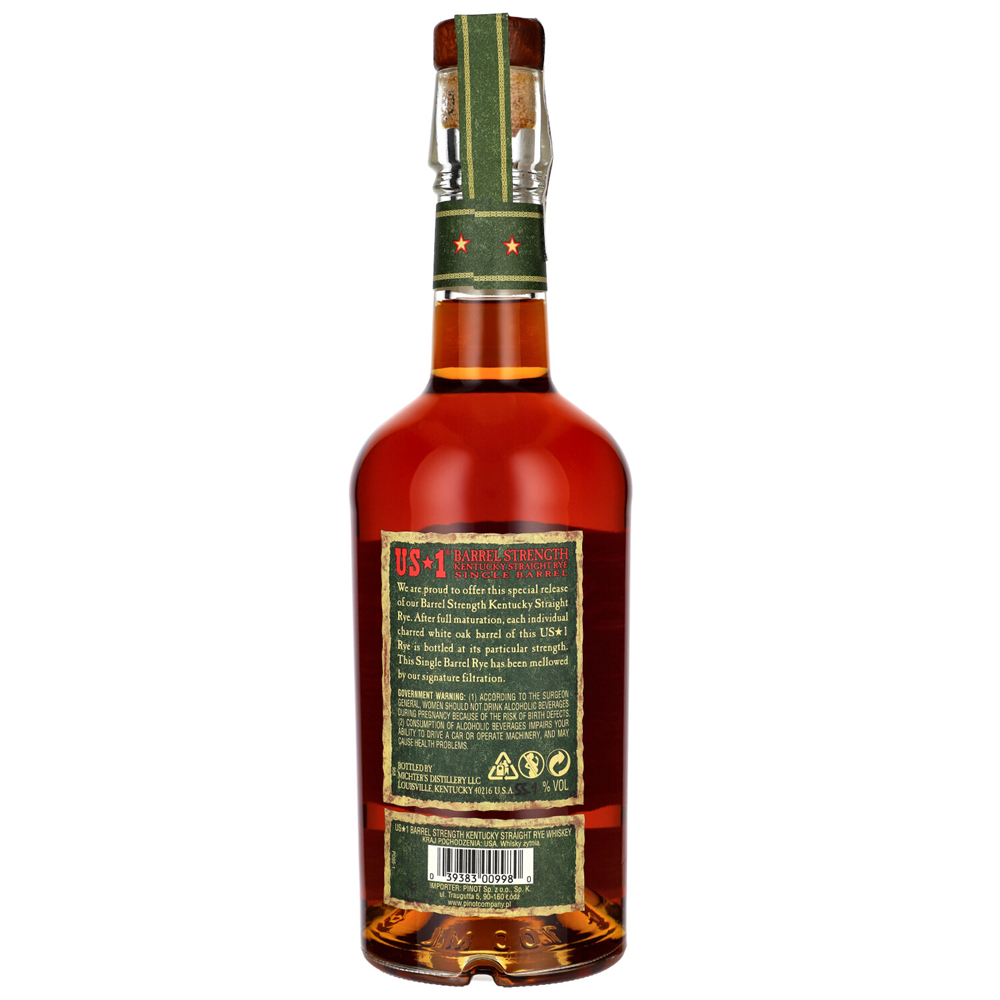 Michter's US-1 Barrel Strength Rye 55,1% to prawdziwy skarb dla miłośników wyjątkowych whiskey. Napełniana przy mocy 103 proof, ta whiskey oferuje intensywne doświadczenie, z gładkością i bogactwem smaku, mimo wyższych kosztów beczek i przechowywania.