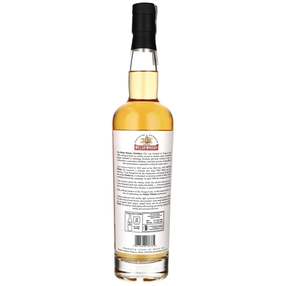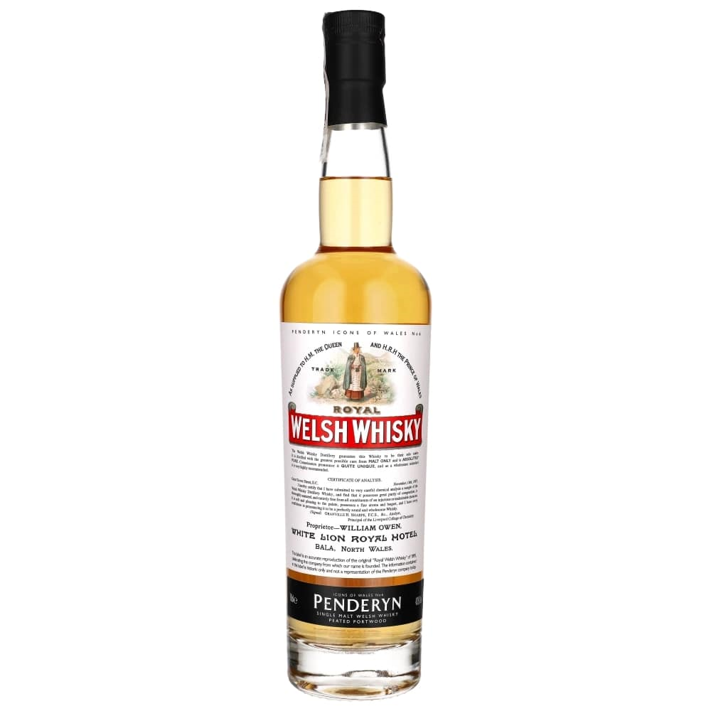 PENDERYN ROYAL WELSH Szósta pozycja pochodząca z serii „Icons of Wales”, upamiętniająca oryginalną destylarnię Welsh Whisky w Frongoch, w pobliżu Bala, która została zamknięta ponad 100 lat temu. W nosie delikatny dymny torf z wanilią, lekkie czerwone jagody i solony karmel. Na podniebieniu dominują słodkie dymne nuty toffi z niuansami czarnego pieprzu. Finisz jest delikatny, z wanilią i korzennymi przyprawami na koniec.
