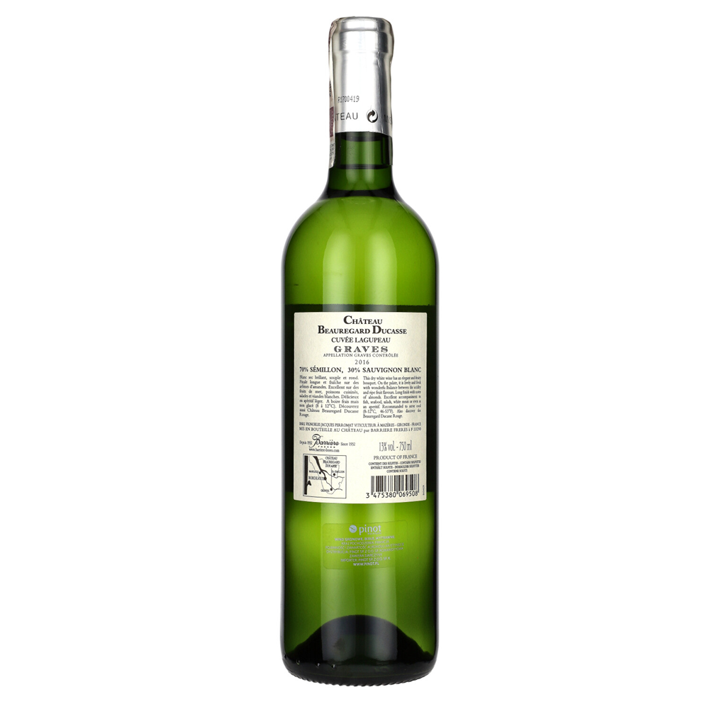 CHATEAU BEAUREGARD LAGUPEAU BLANC - powstało z dwóch odmian: 50% Sauvignon Blanc i 50% Sémillon. Tradycyjna winifikacja, tłoczenie pneumatyczne, fermentacja regulowana w temperaturze 18 stopni Celsjusza. Wino dojrzewa w całości w kadziach ze stali nierdzewnej przez 8 miesięcy.